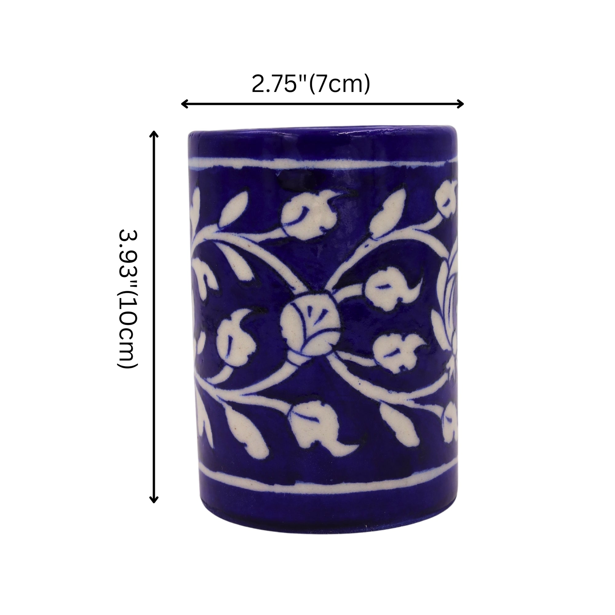 Experience the magic of India with our Blue Pottery Green Color Pen Holder. This exquisite piece depicts intricate craftsmanship, showcasing the rich heritage of Indian artistry. This alluring Royal Blue base, adorned with detailed white and blue Leafy patterns, adds a captivating charm to any space. Embrace the beauty of this handcrafted masterpiece to elevate your home with elegance and sophistication.