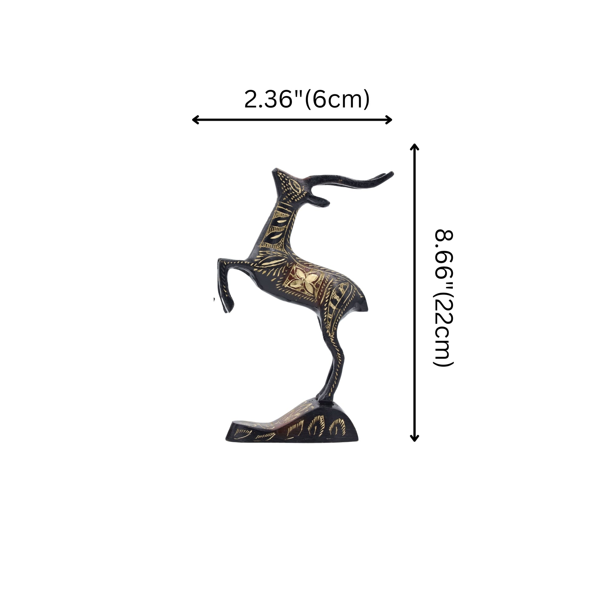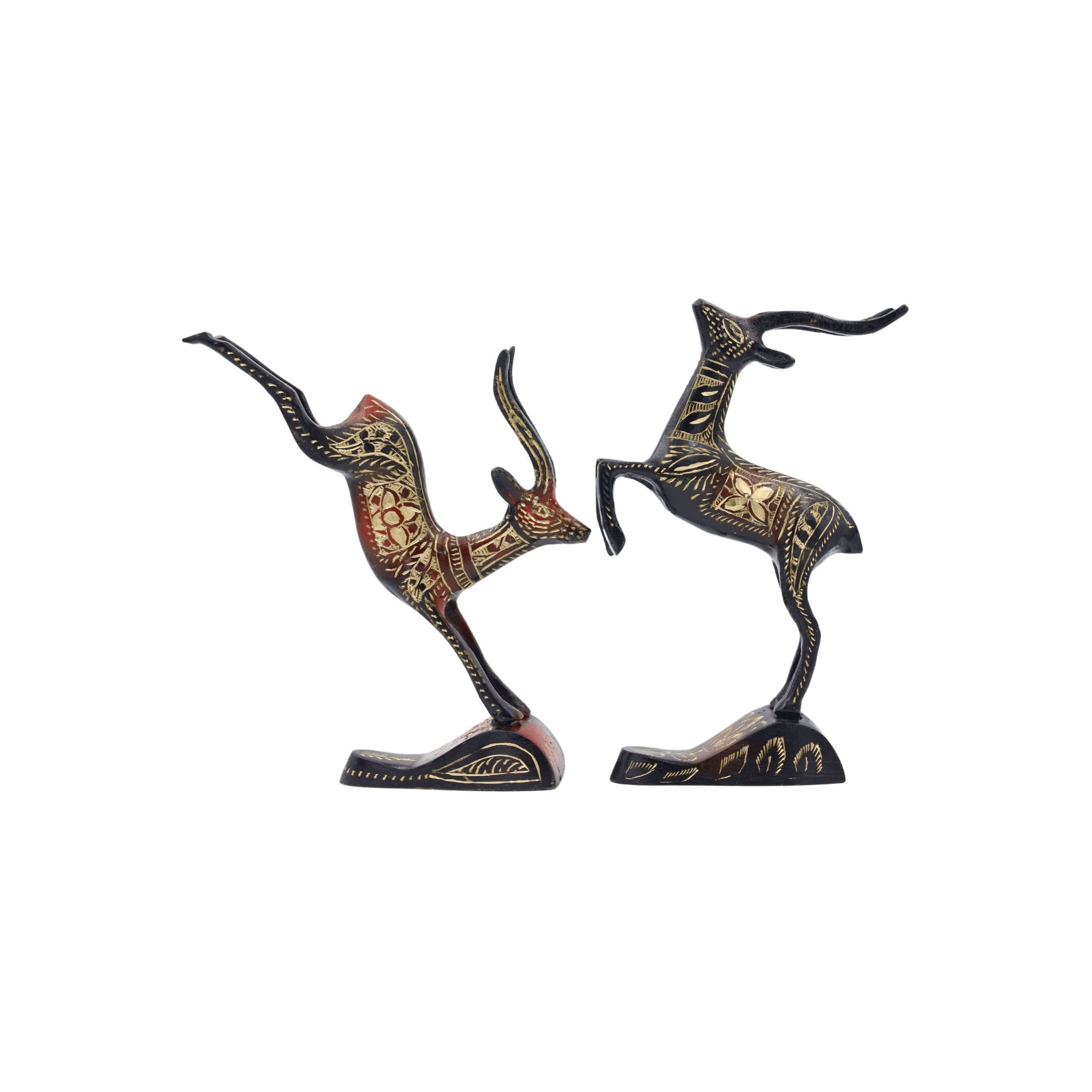 Enhance your space with this stunning brass deer pair, featuring intricate metalwork and a striking dark brown and gold finish. Perfect for any table, shelf, or mantelpiece, these elegant statues add sophistication and charm to any decor.