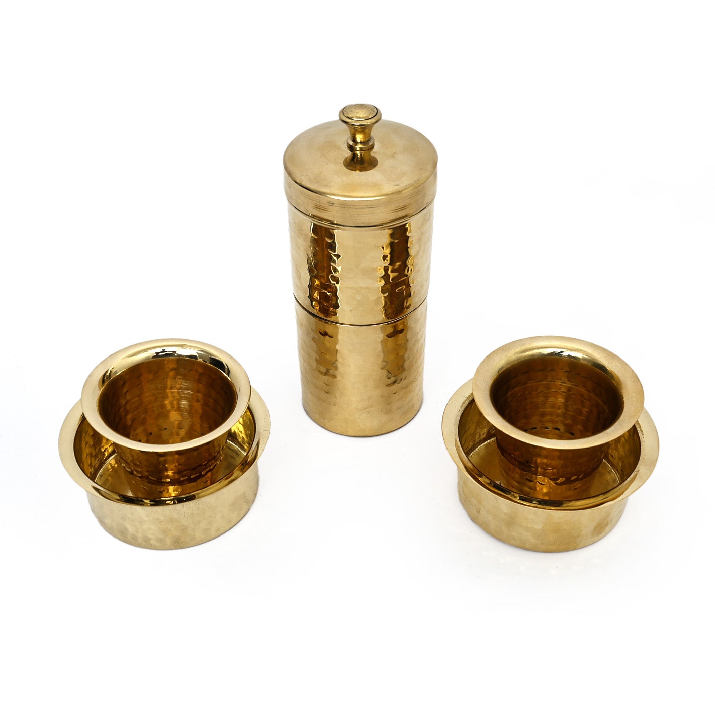 Bring warmth to your home with this glossy finish Dabara-Tumbler set and coffee filter, allowing you to make your coffee. This set is an elegant pairing which has authentic functionality and timeless design. It is perfect for lovers of filter coffee, as this brass set, crafted by skilled artisans, allows you to serve coffee traditionally. It delivers rich and aromatic decoction in a slow drip process, and you can serve the filter coffee with a Dabara set. This piece is made from pure brass and finished with a glossy polish, giving a regal touch to your dining space. This set has 2 Dabara and tumbler sets and 1 coffee filter