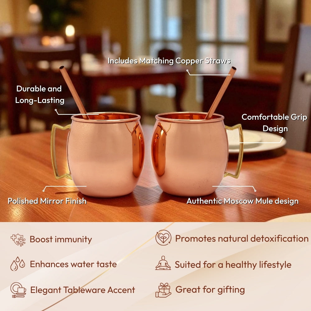 Classic Moscow Mule Copper Mugs | Set of 2 with Pure Copper Straws