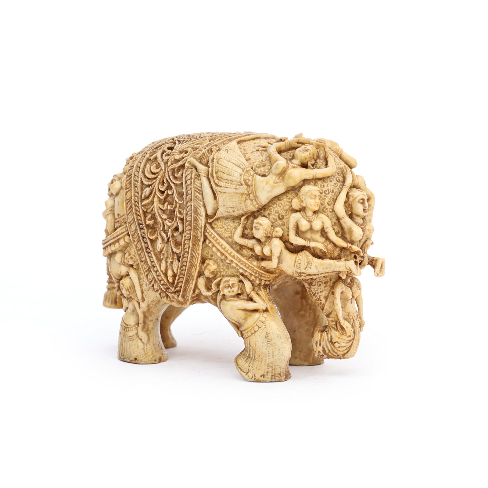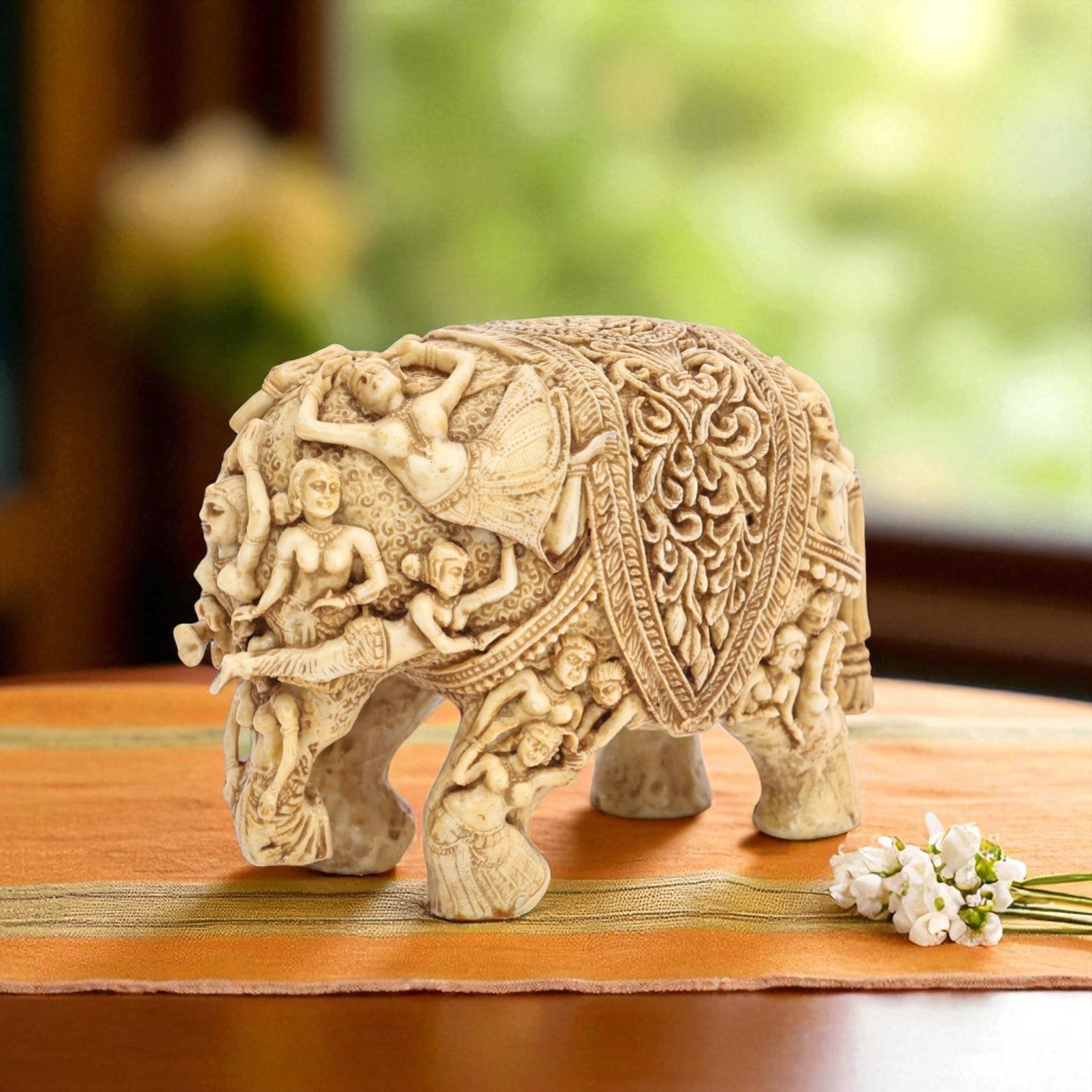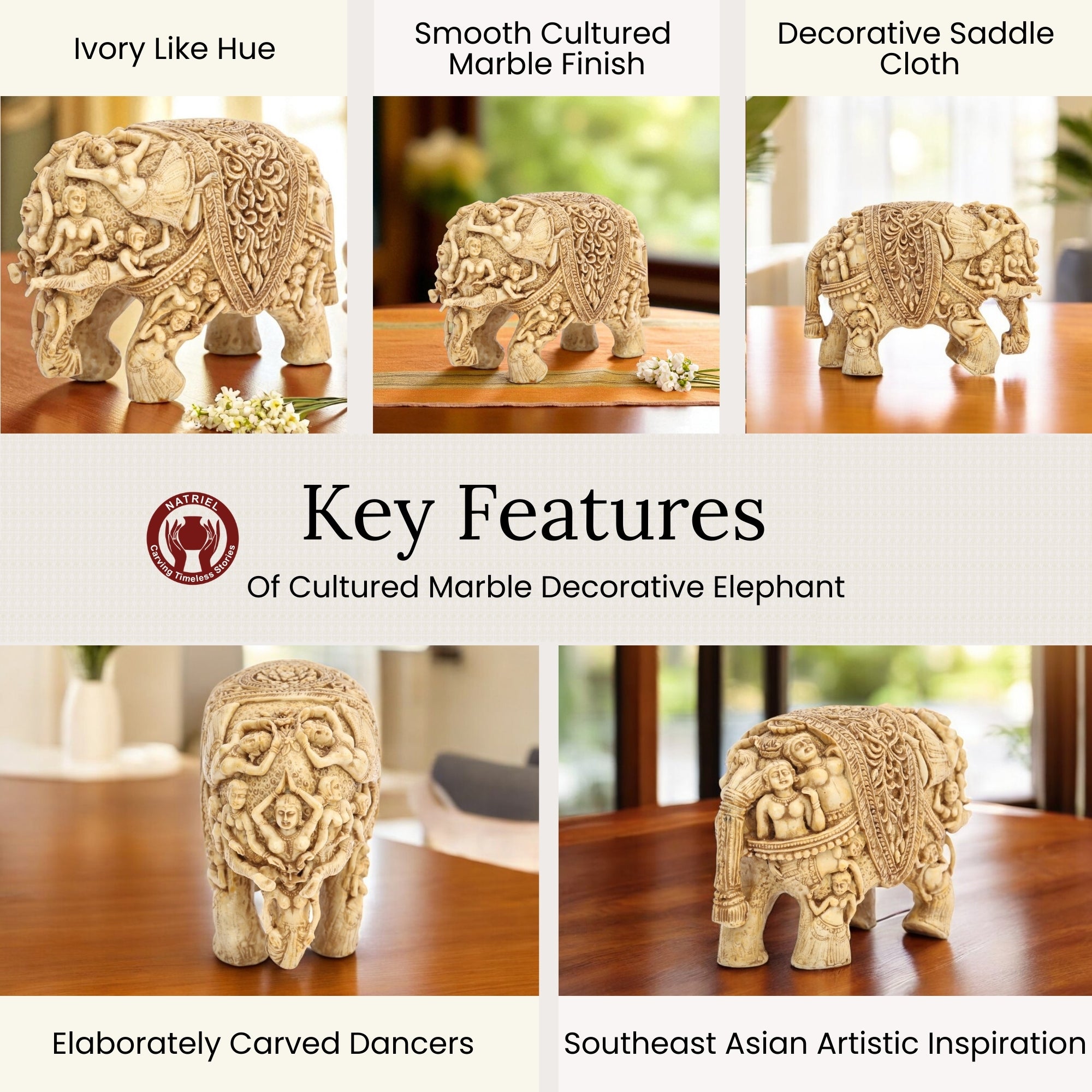 Discover this Cultured Marble White Elephant, featuring elaborately carved dancers on its surface. It features dancers on the front with decorative saddle cloth adorned with paisley patterns. A great deal of attention is paid to the storytelling motifs on the figurine. It has a warm beige colour with dark shading on the edges that emphasises carvings. Crafted from cultured marble, this product has a smooth finish that mimics a graceful ivory hue.