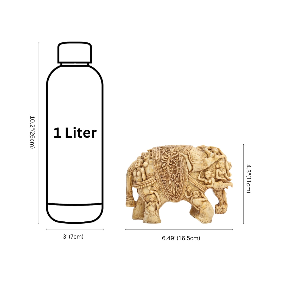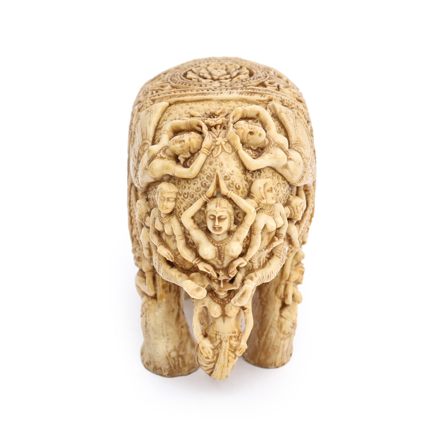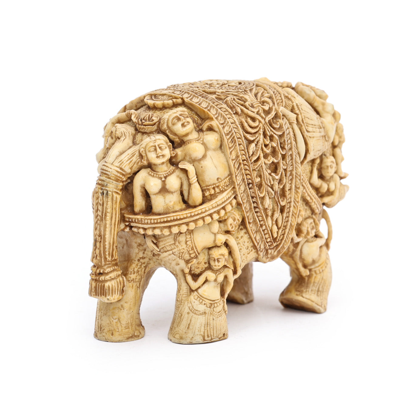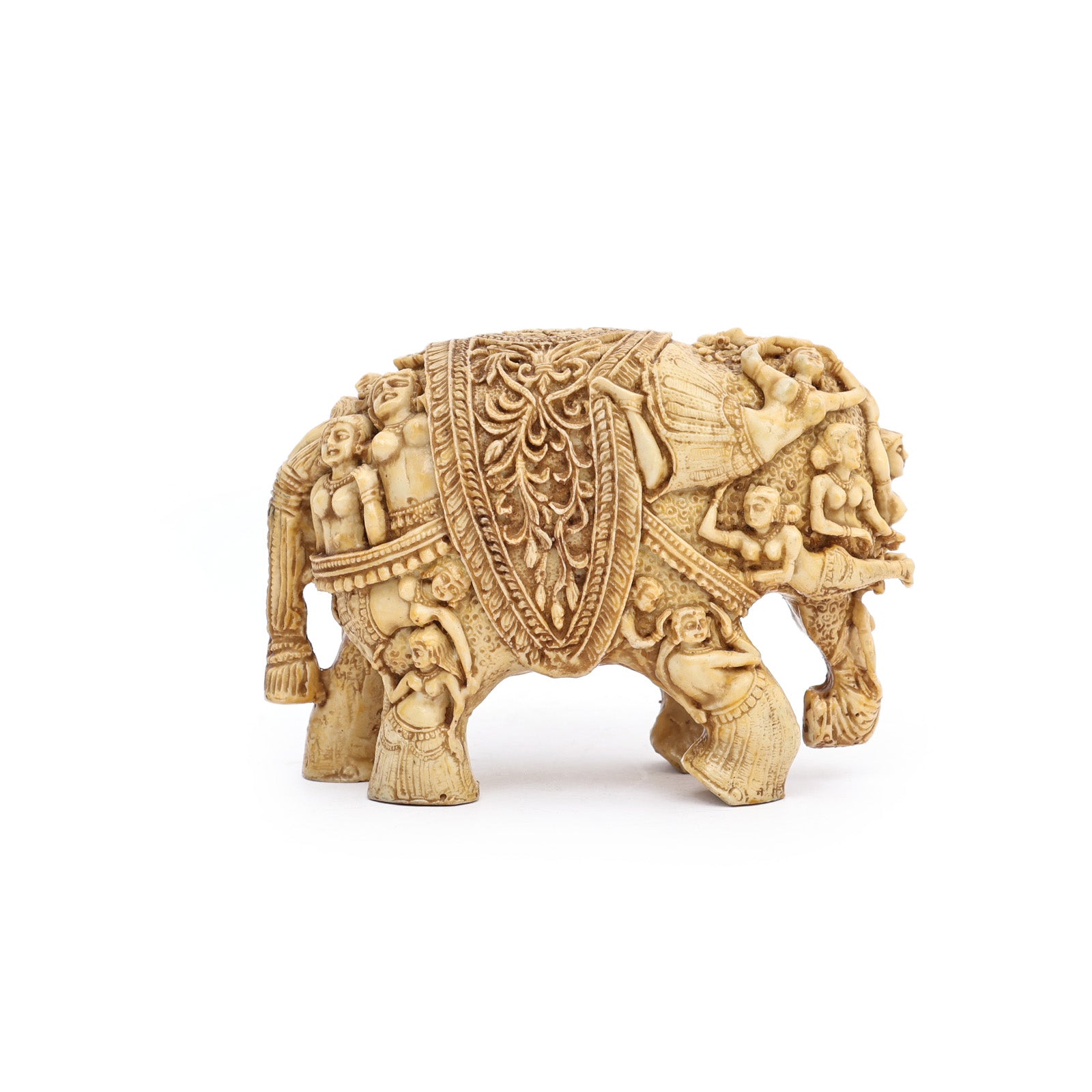 Discover this Cultured Marble White Elephant, featuring elaborately carved dancers on its surface. It features dancers on the front with decorative saddle cloth adorned with paisley patterns. A great deal of attention is paid to the storytelling motifs on the figurine. It has a warm beige colour with dark shading on the edges that emphasises carvings. Crafted from cultured marble, this product has a smooth finish that mimics a graceful ivory hue.