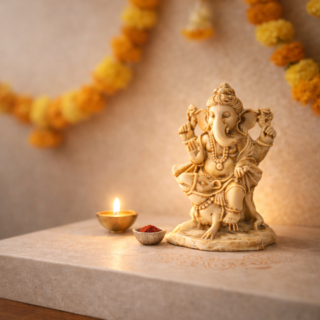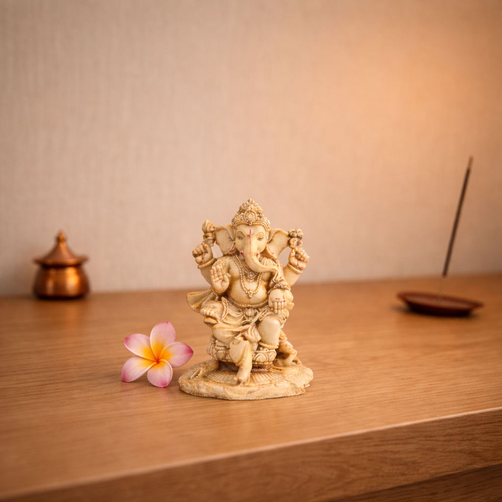 - Intricate hand detailing – This handcrafted Ganesha idol has intricate carvings on the product. It showcases Ganesha in a four-armed posture holding a modak on a raised base. Ganesha is in a blessing pose with a serene expression, capturing his graceful form.