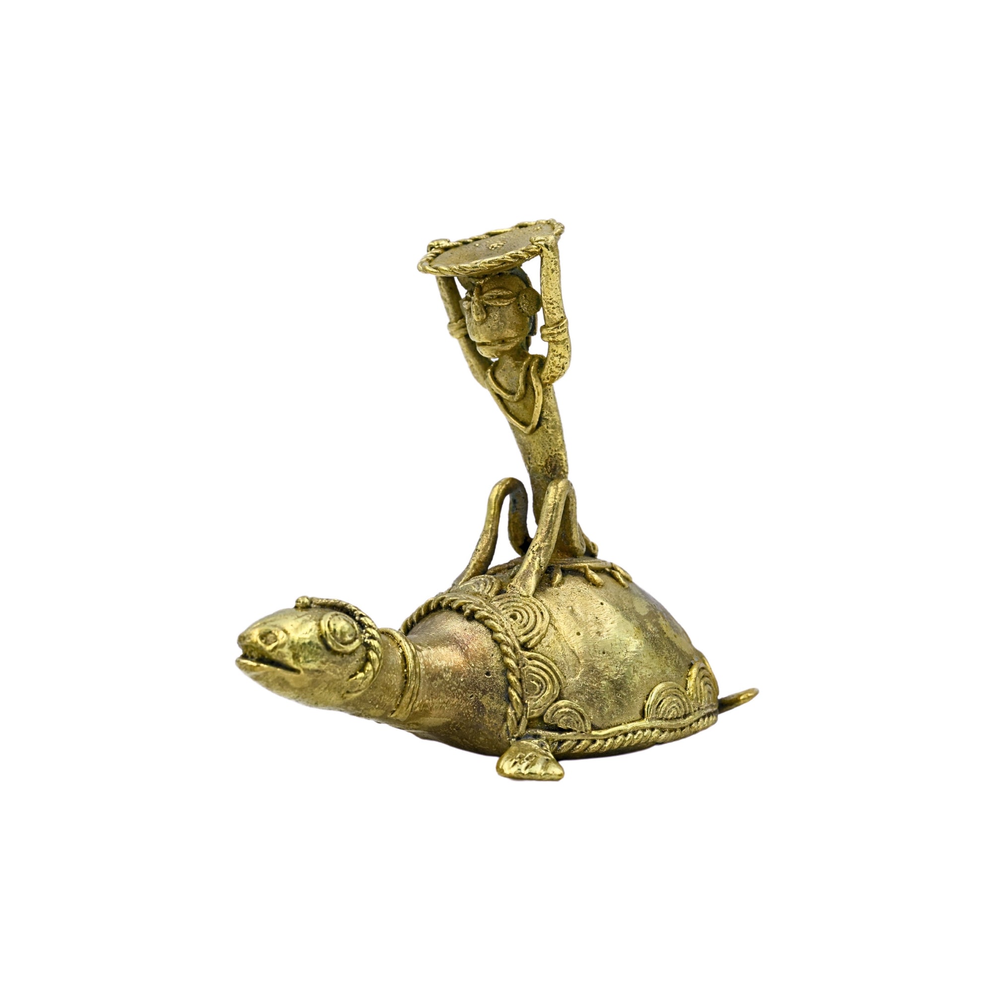 Delve into the rustic charm of Dhokra art from Chhattisgarh, India. The art features a human figure gracefully sitting atop a tortoise, symbolising longevity and wisdom. Intricate carvings on both the tortoise's shell and the figure's attire highlight the artisans' skill, celebrating the rich heritage of Indian craftsmanship.