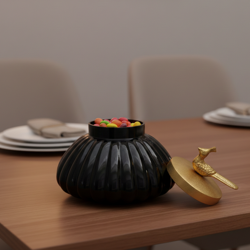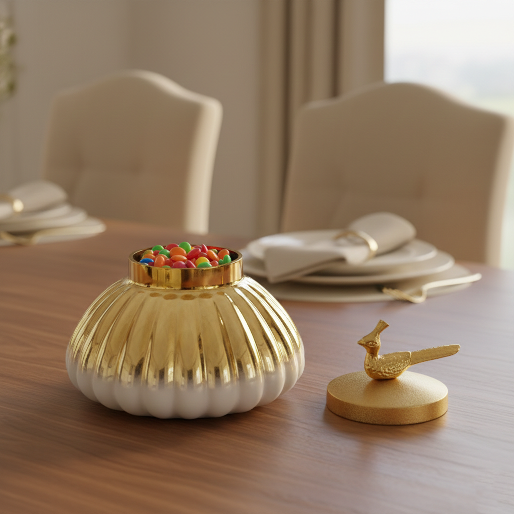 Make a statement with this multipurpose jar, featuring a stylish ribbed design and a luxurious gold lid adorned with a charming bird figurine. Perfect for both décor and storage, it adds a refined touch of elegance to any living space. Whether on a shelf or table, it enhances your home with chic appearance.