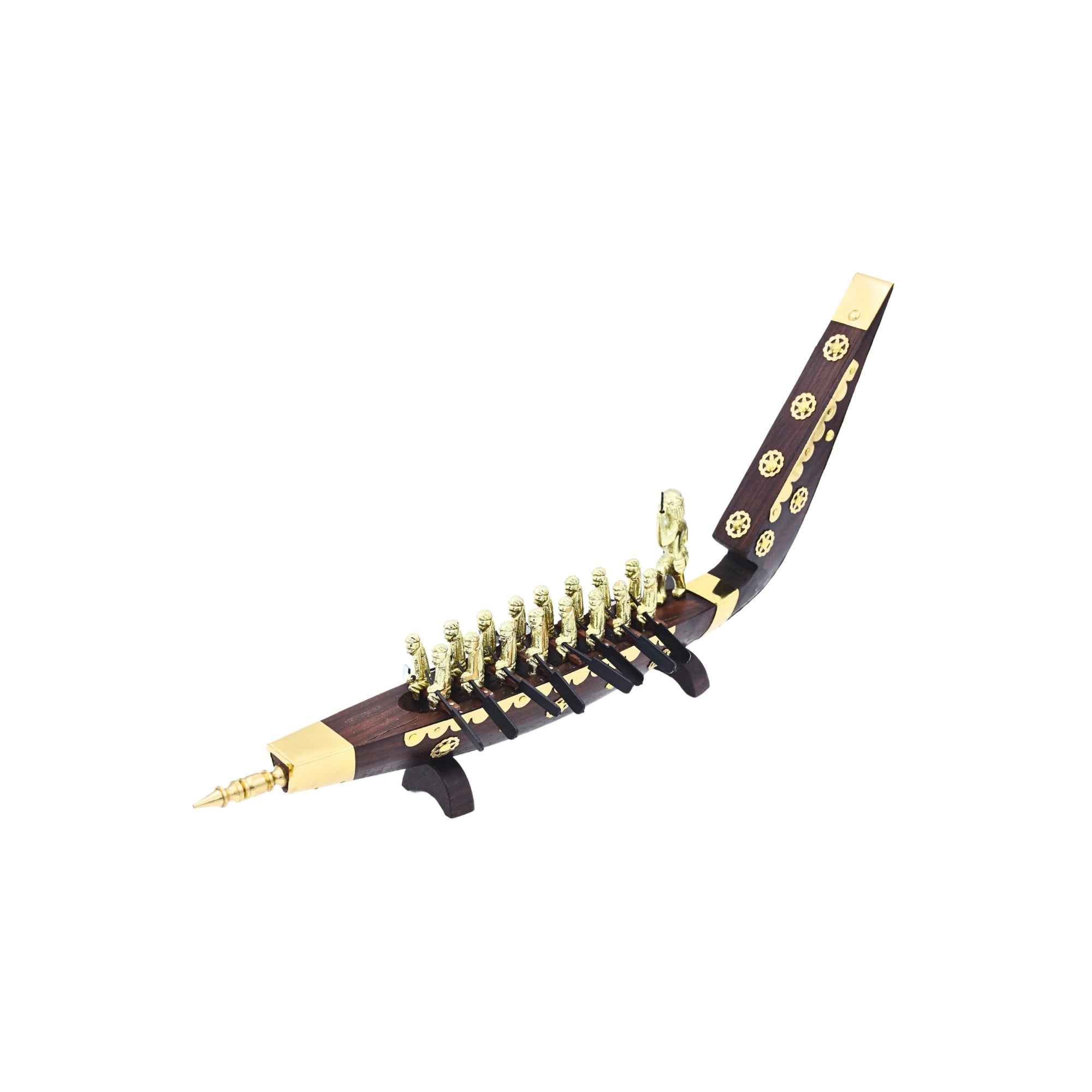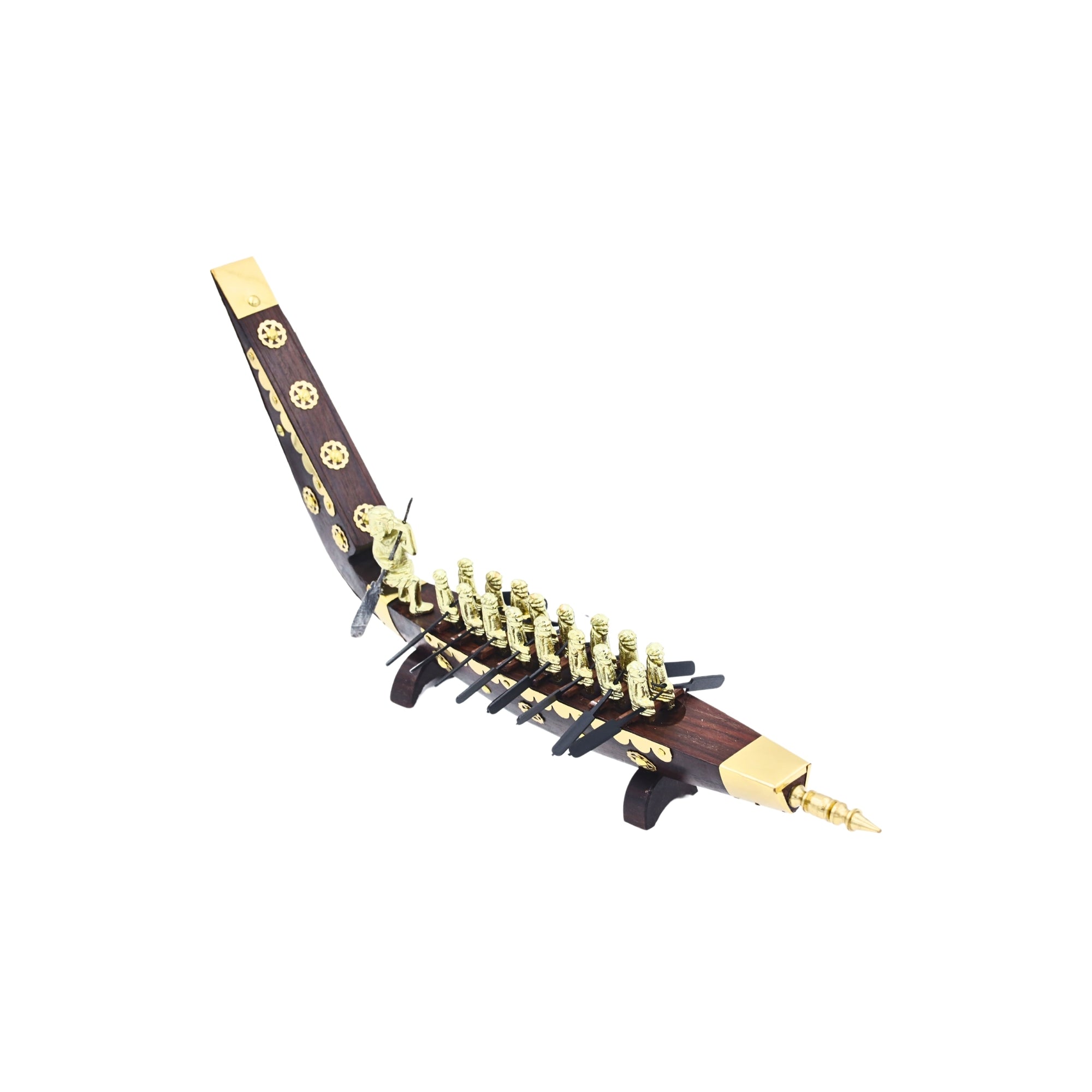 Jazz Up your decor with this Palliyodam snake boat miniature. This replica is meticulously crafted with rich wood and adorned with elements. The product depicts 17 rowers on the boat, embodying the ritual of the boat race festival during Onam.