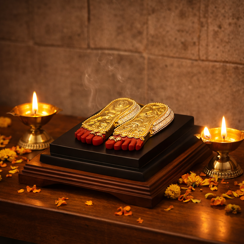 - Unique Design: These are Laxmi Charan Paduka, featuring gold plating with red accents on the toes. The Charan are inscribed with sacred symbols, representing wealth and prosperity.