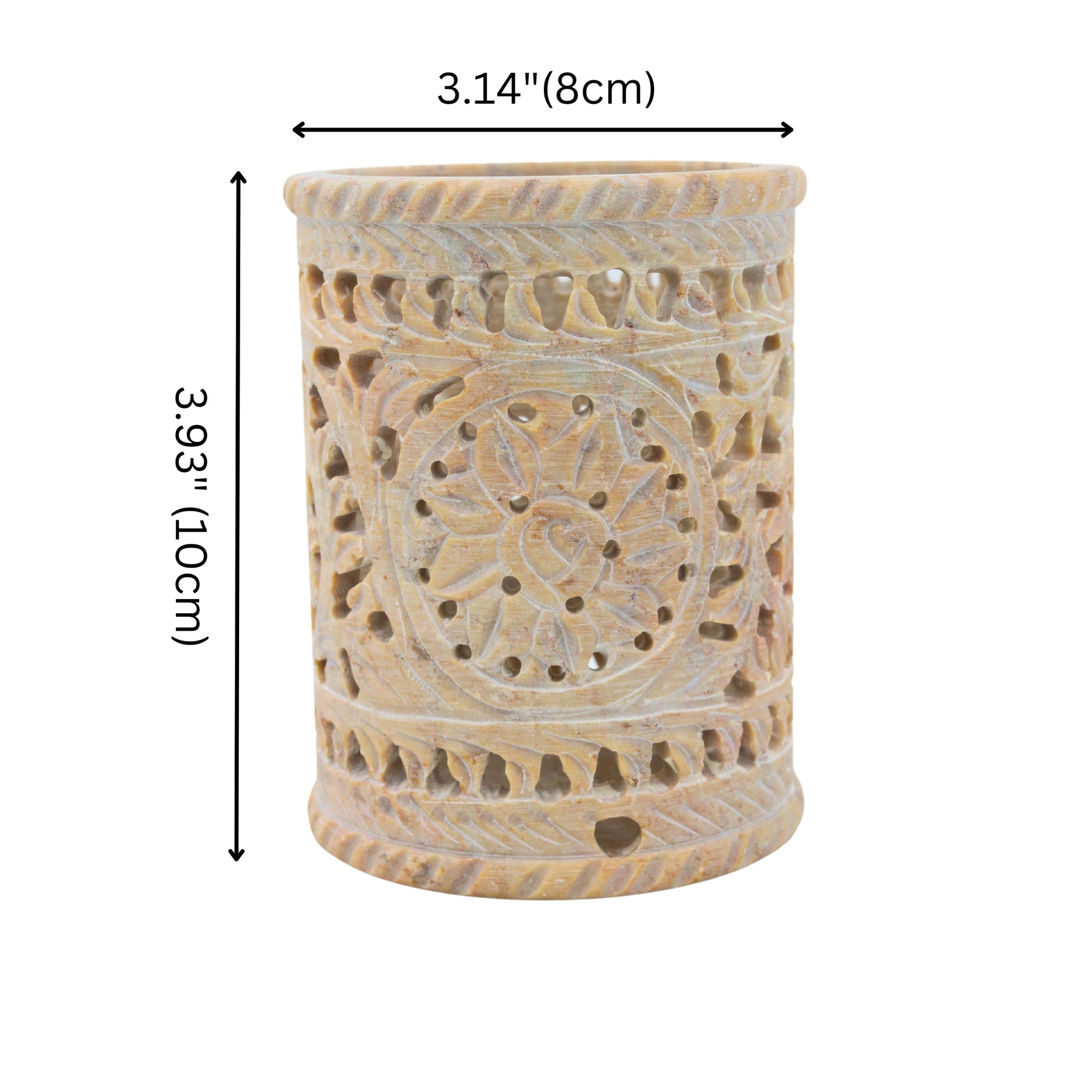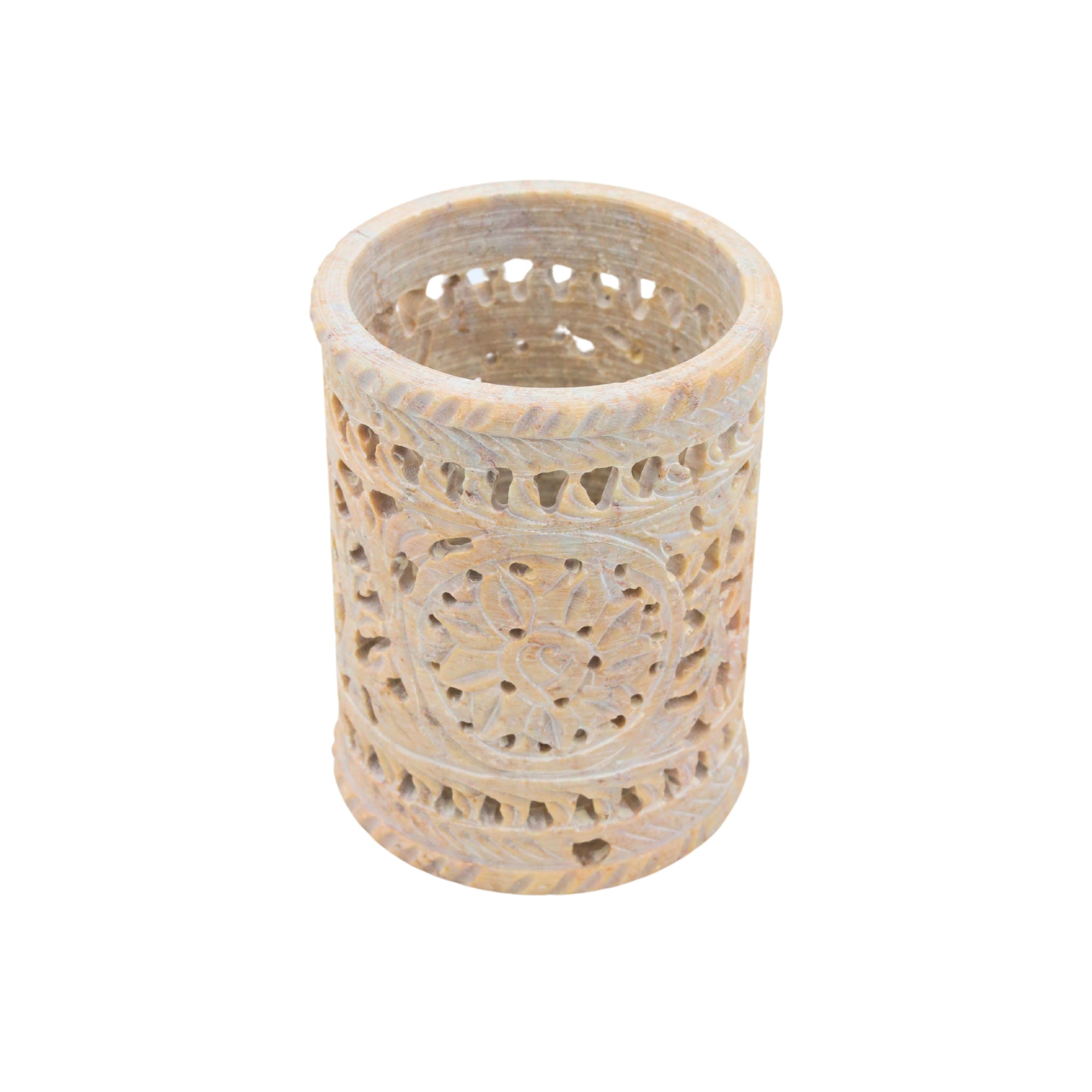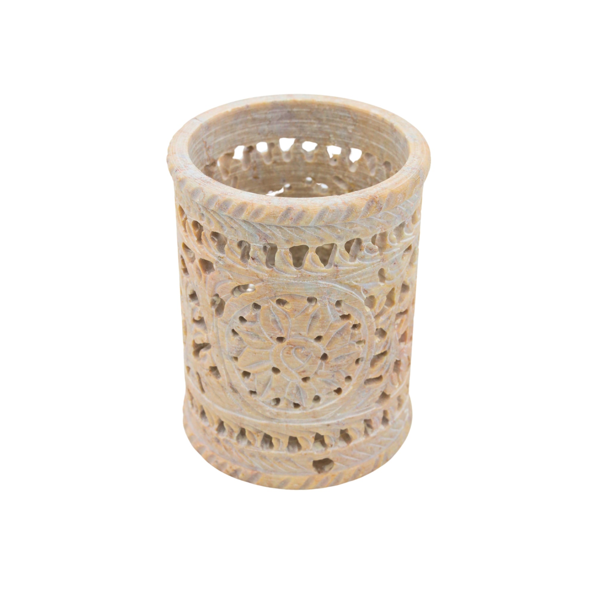 Discover this remarkable soapstone pen holder that reflects the spirit of Indian craftsmanship with its beautifully hand-carved floral and leaf Jaali designs. Its deep, earthy hues and sleek finish make it a striking piece, seamlessly combining functionality with classic charm.