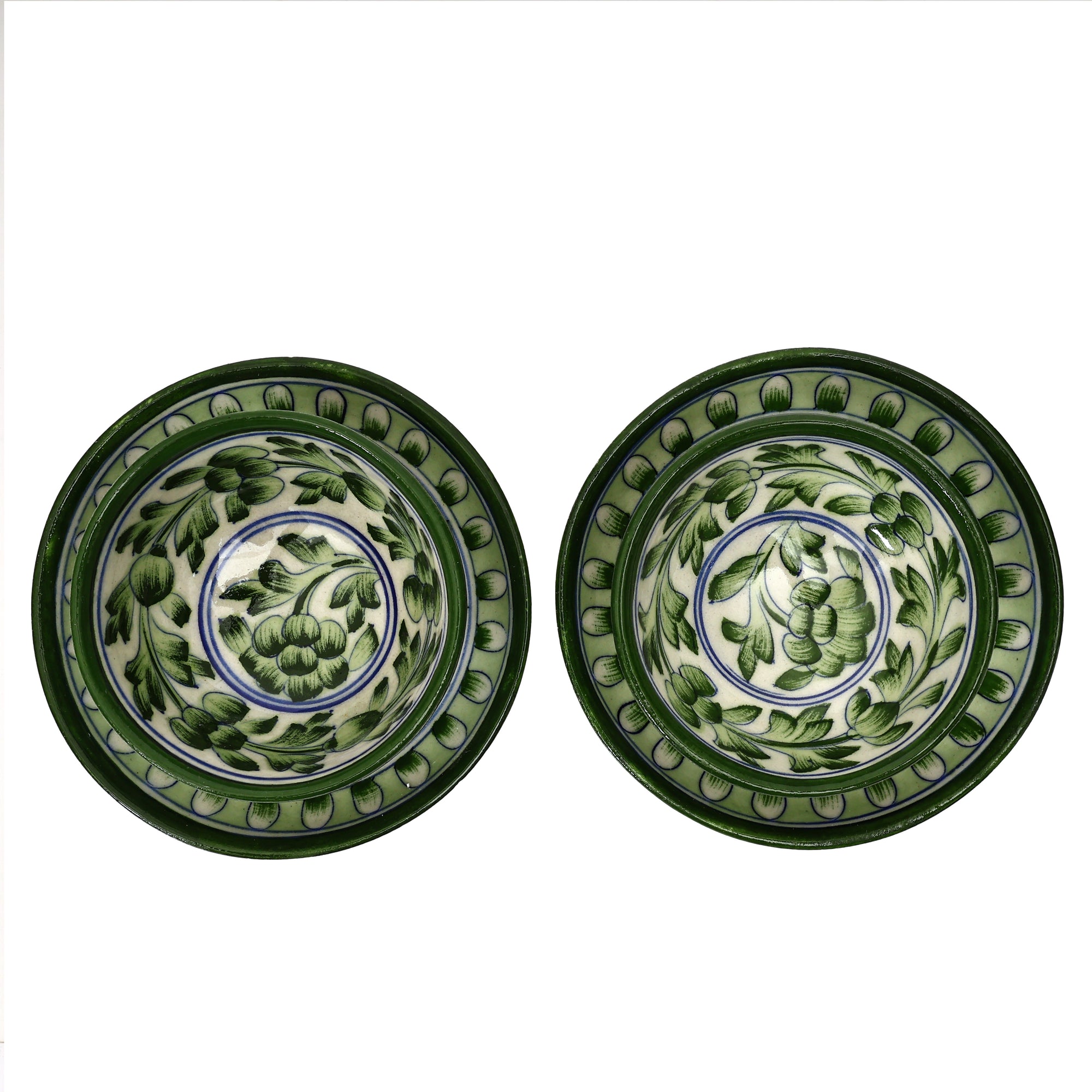 Bring home a piece of Jaipur’s rich Blue Pottery tradition with this stunning handmade bowl and plate set. Crafted by skilled artisans, this set showcases intricate floral motifs in a refreshing green hue, adding an elegant touch to your home décor and dining collection. This handcrafted Blue Pottery set effortlessly blends art and functionality, making it an exquisite addition to any home.