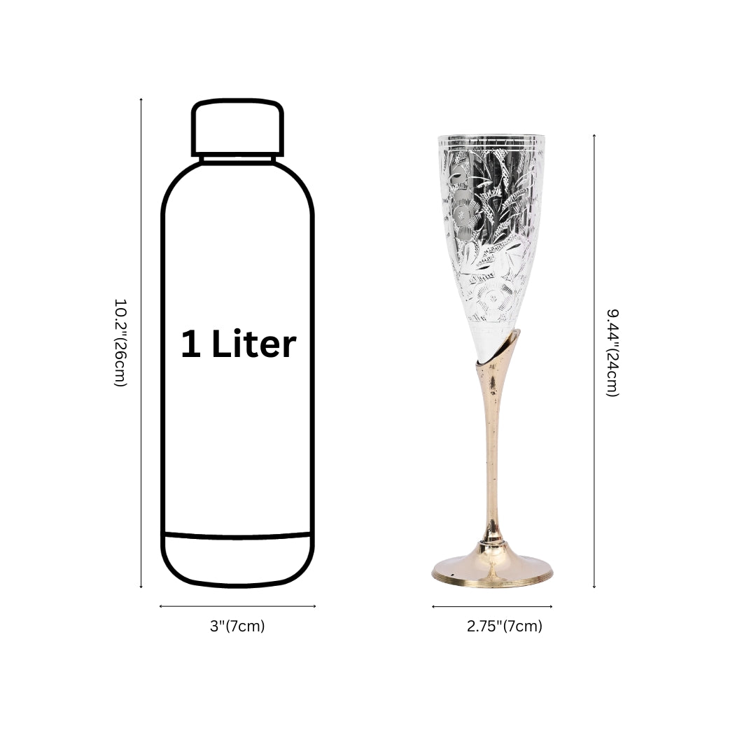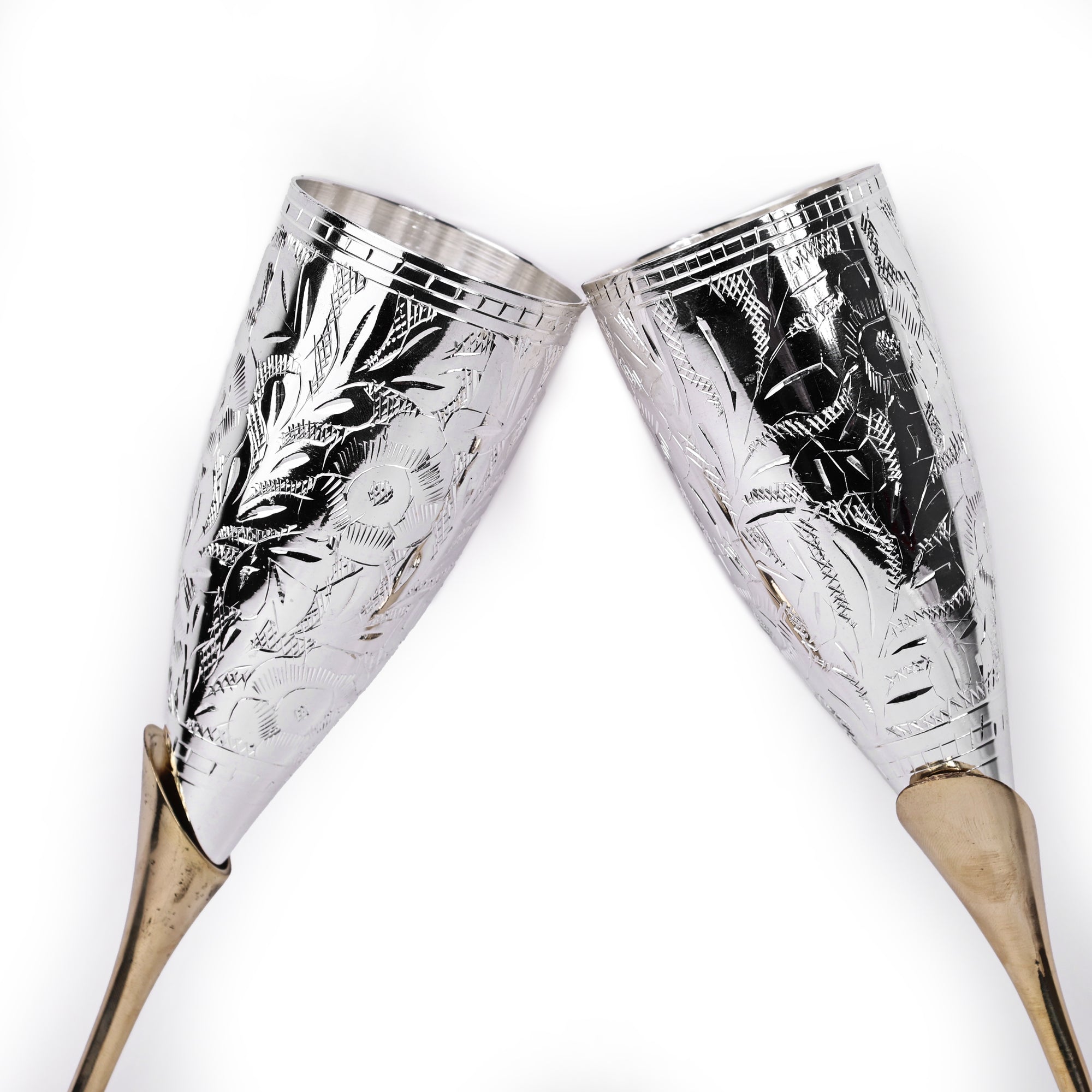 Bring home sophistication with this Handcrafted Brass Champagne Flute. Designed by expert artisans, this piece features intricately etched floral motifs on the flute cup using traditional metalwork techniques. The flute cup is finished with silver plating, beautifully contrasted with a gold-toned stem and base. It is made from brass, so it is durable, sturdy, and can be used for a long time. Designed for date nights, anniversaries and Valentine's Day celebration, this piece brings charm to your table. Ideal for champagne, mocktail, festive drink or decorative table accent. It is a perfect premium gifting option for housewarming, weddings, and anniversaries.