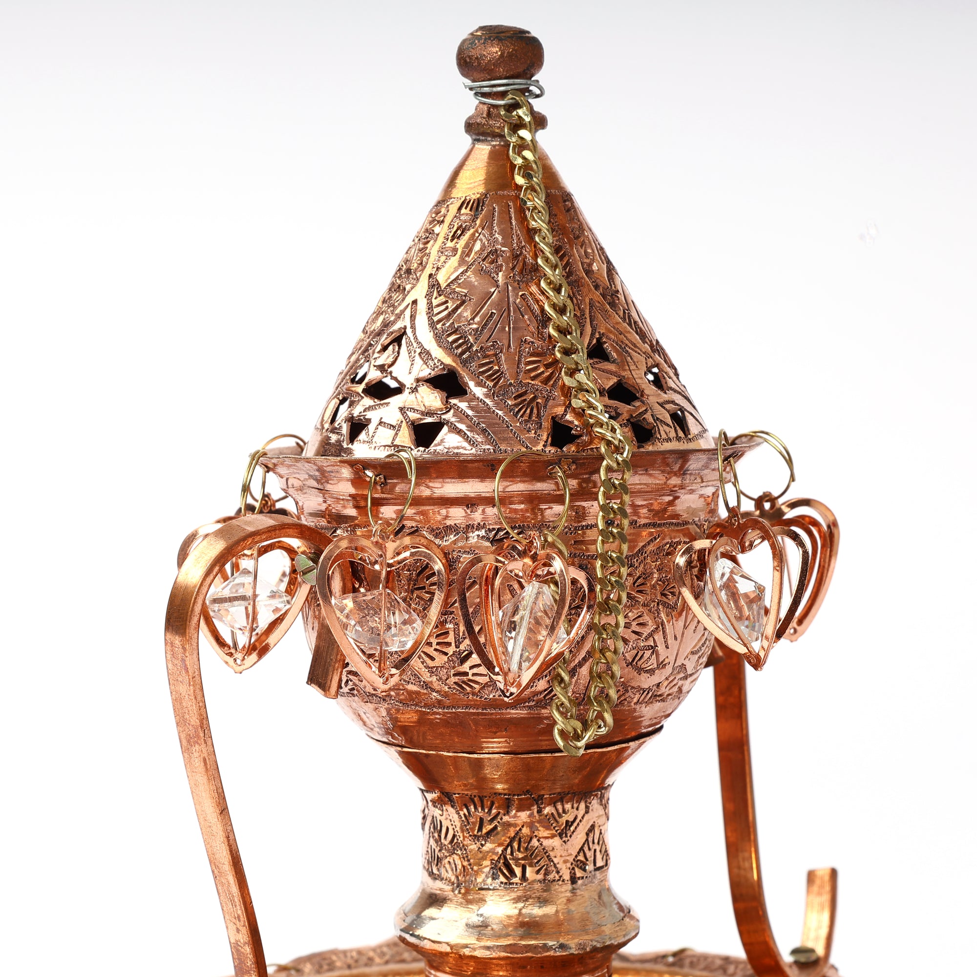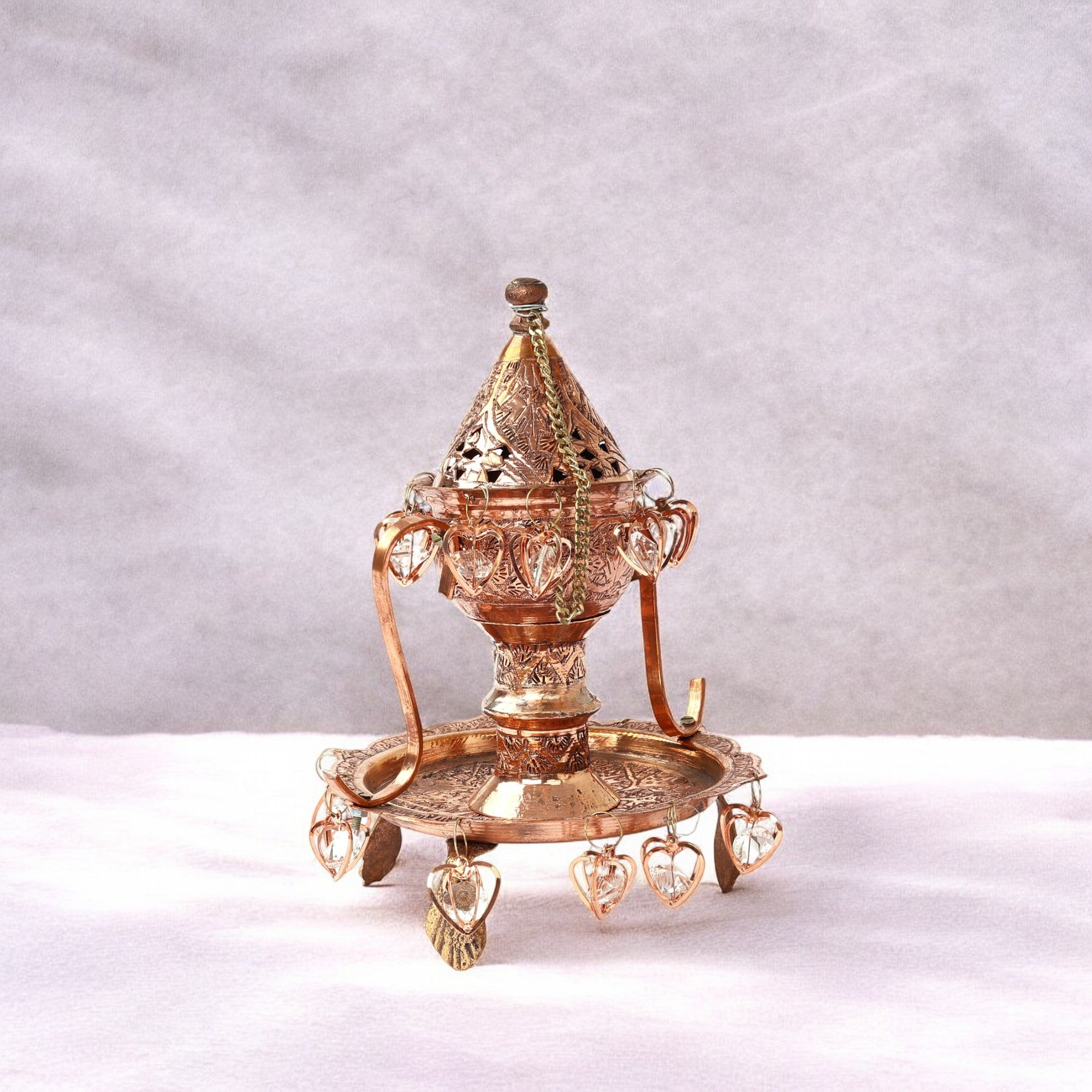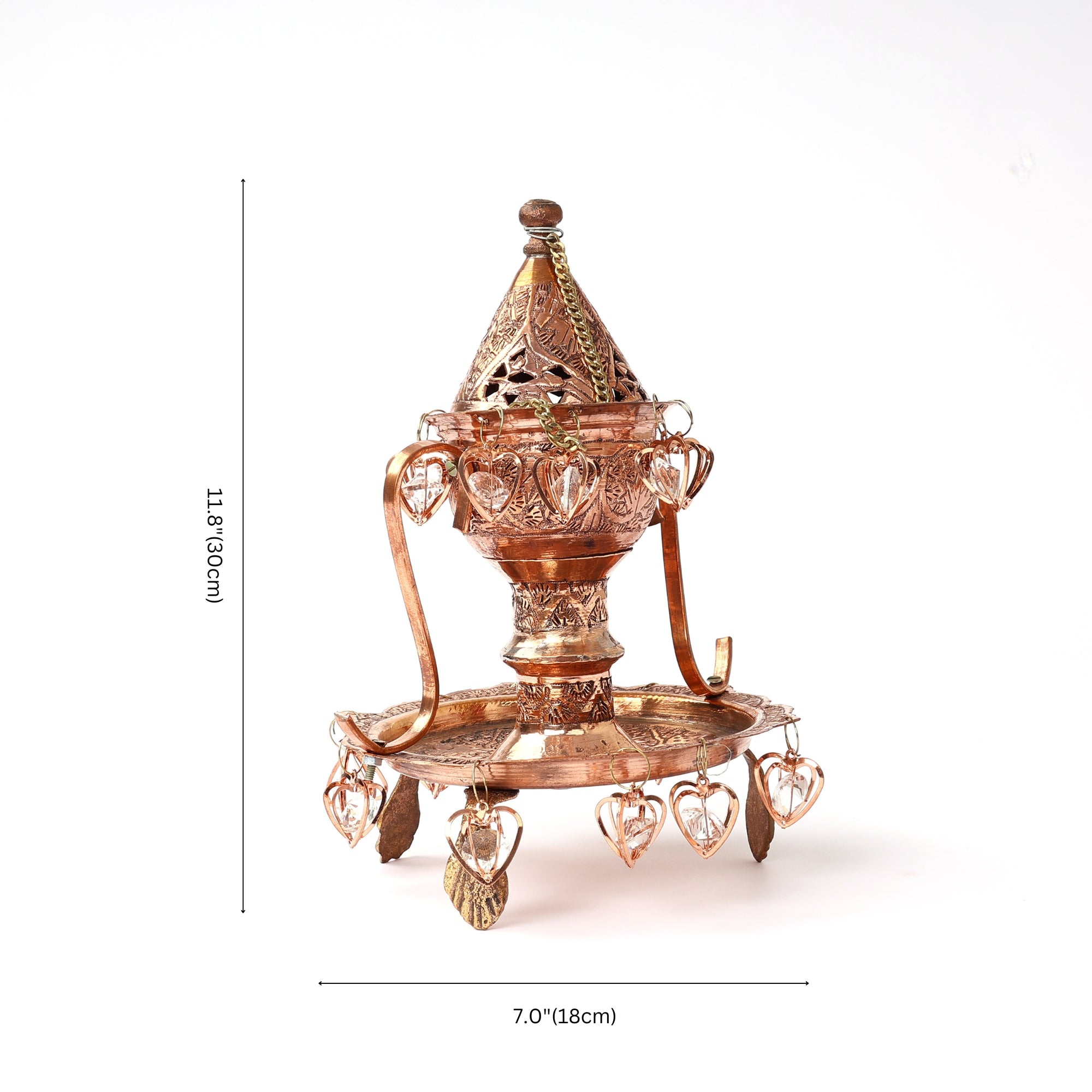 Breathe in elegance with this exquisitely handcrafted copper incense burner. Its intricate chinar leaf engravings capture the soul of eternal craftsmanship. Embellished with delicate heart charms, this alluring piece is perfect for sacred rituals, creating a peaceful ambience for your space by blending heritage with functionality.