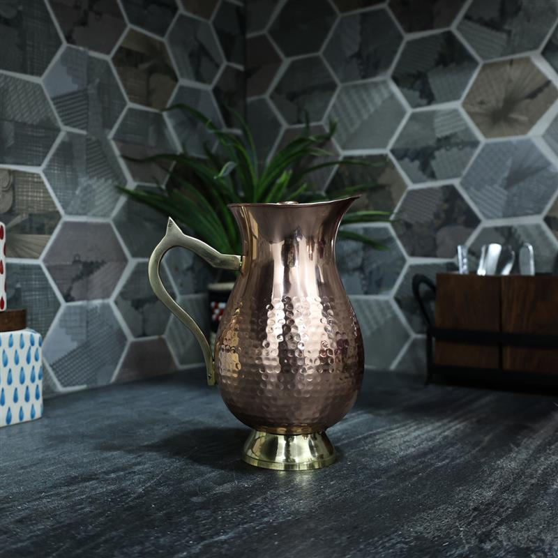 Elevate your daily hydration routine with this Handcrafted Hammered Copper Water Pitcher, beautifully designed to combine elegance with the age-old wisdom of Ayurveda. Featuring a gently curving silhouette, this pitcher is crafted from high-grade copper and finished with a hammered texture for a striking look. The gracefully arched finished handle and sturdy base ensure easy handling and durability. With a matching lid, this pitcher not only enhances your home décor but also helps keep your water clean and infused with the natural benefits of copper. Ideal for both modern and traditional settings, this copper jug is a thoughtful addition to your kitchen or dining area, promoting wellness with every sip.