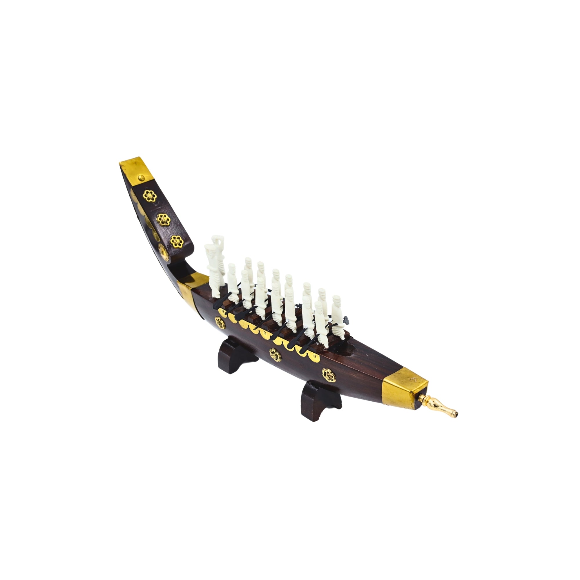 Transform your decor with this miniature Palliyodam snake boat. Carefully crafted from rich wood and adorned with accents, this replica showcases 16 rowers, representing the vibrant tradition of the boat race festival during Onam.