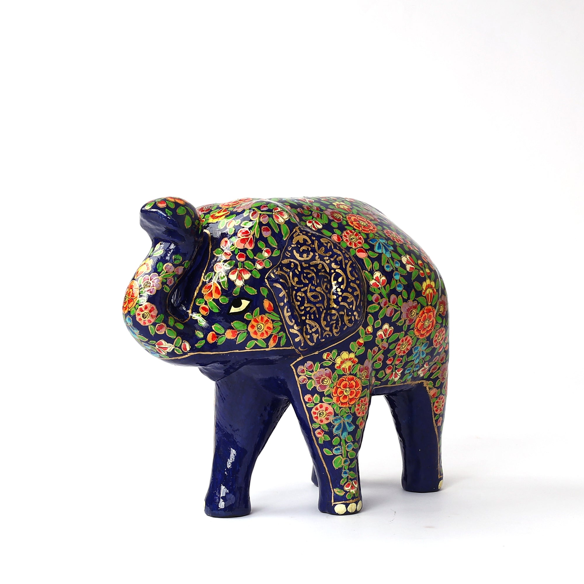 - Blue Paper Mache Elephant with vibrant multi-coloured floral patterns.