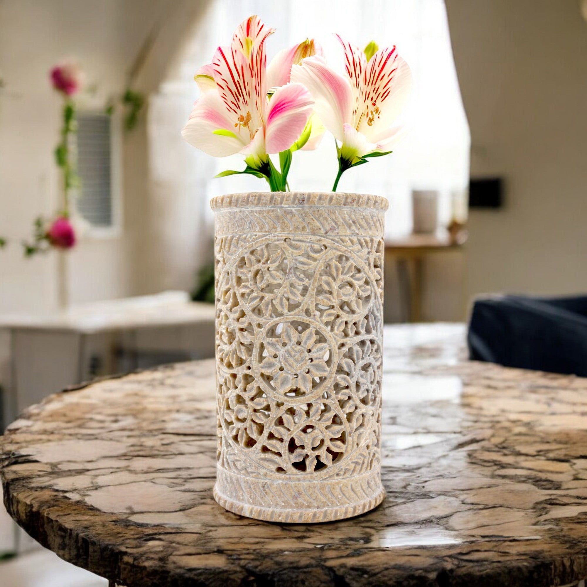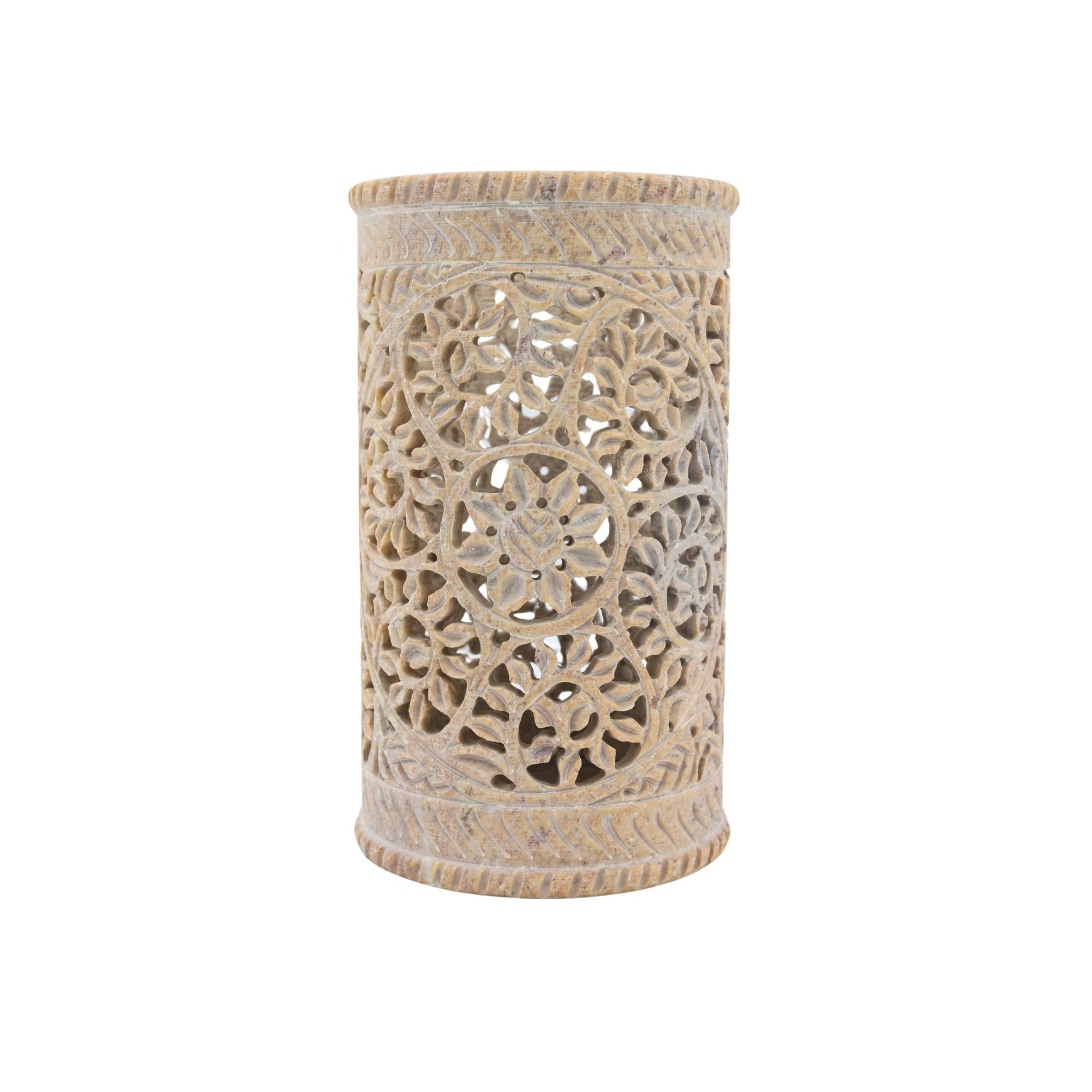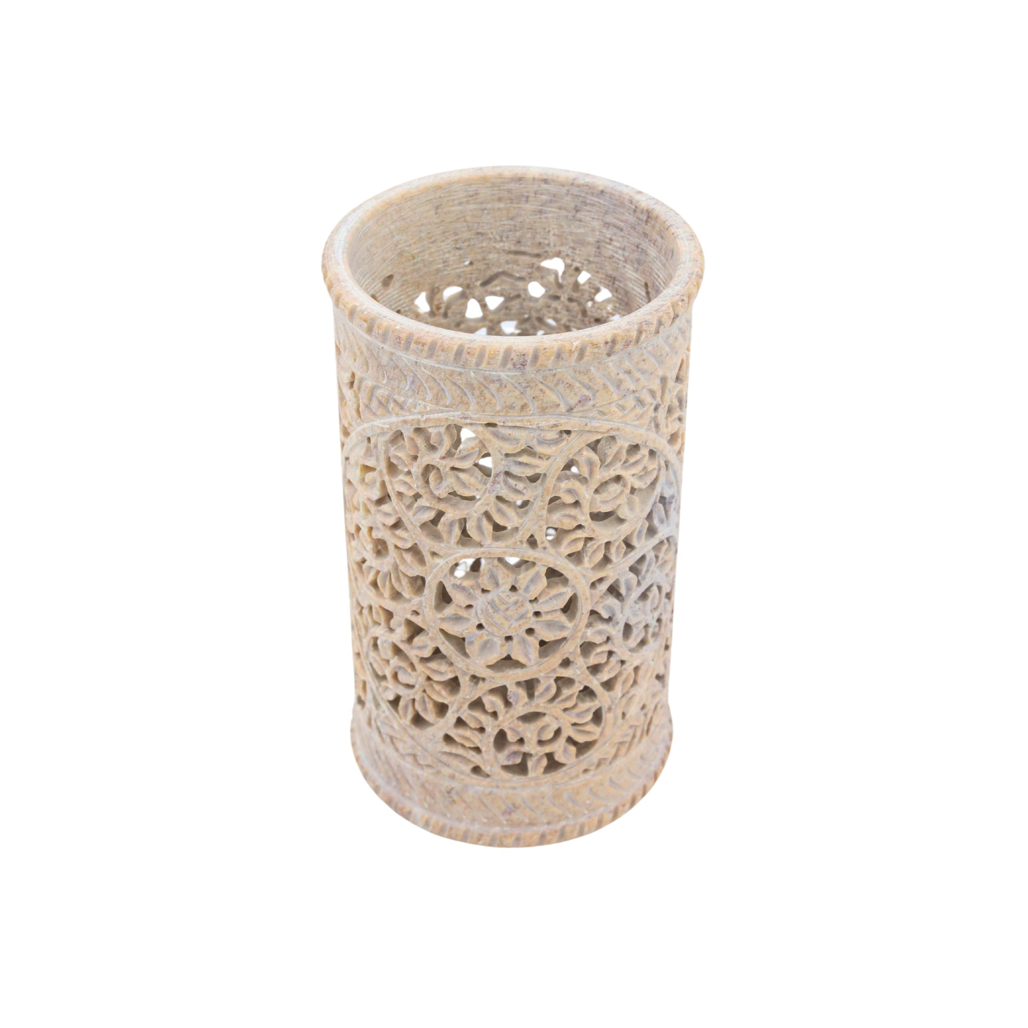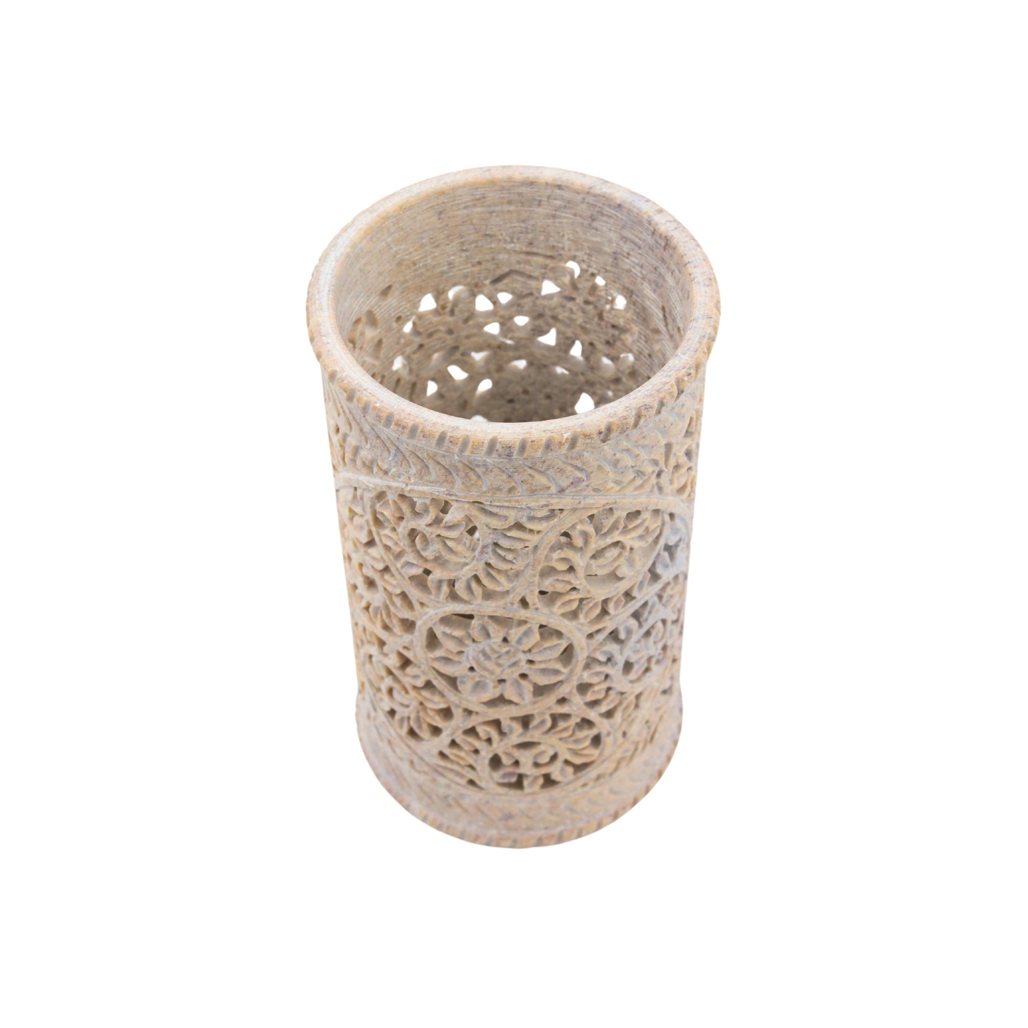 Admire the beauty of this handcrafted soapstone multiutility holder, featuring intricate floral and leaf Jaali motifs. Perfect for organizing pens, pencils and many more items of daily use, its sturdy base ensures accessibility while the natural finish adds a charming touch to any workspace.