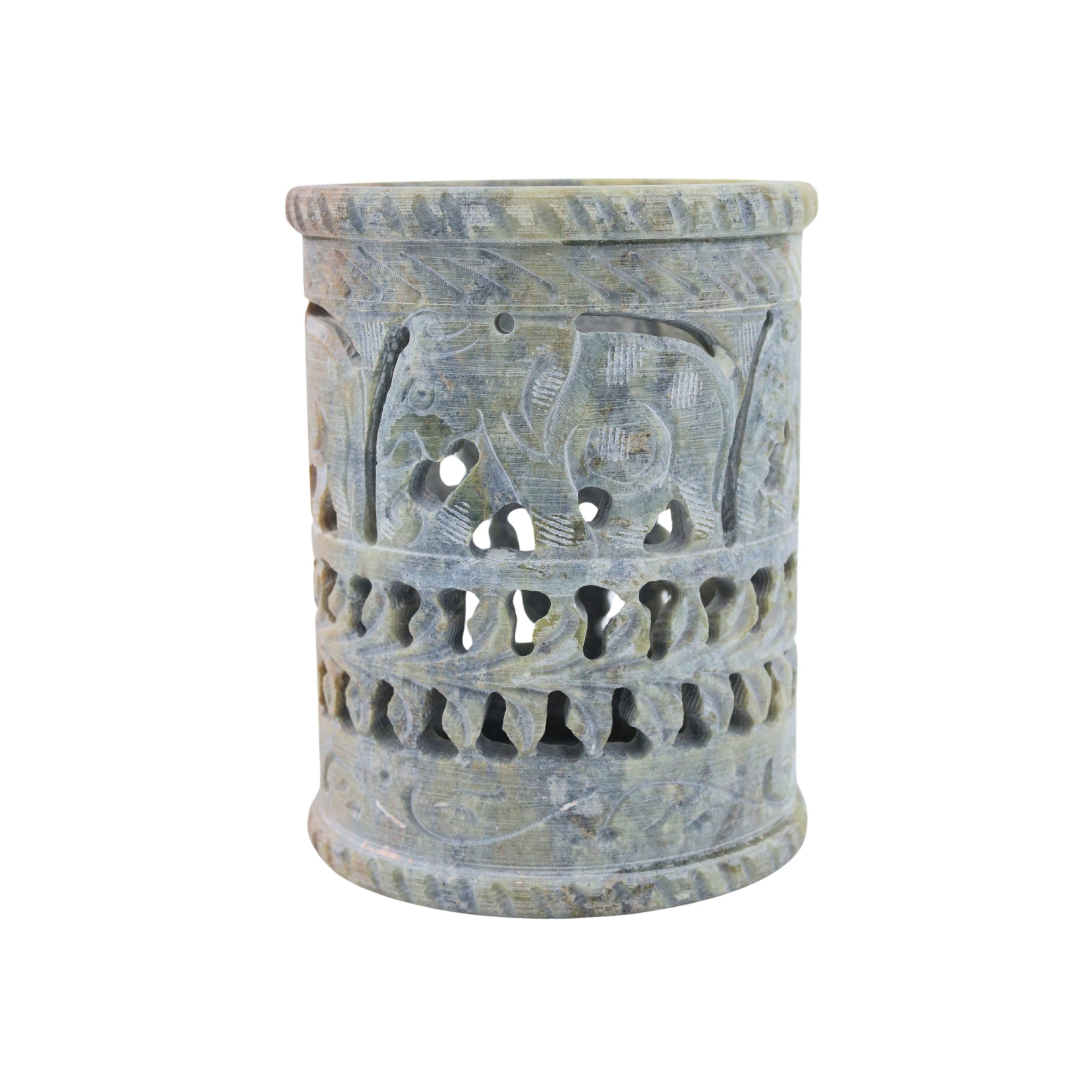 Admire this handcrafted soapstone pen holder with detailed elephant and leaf motifs. Functional and stylish, it keeps your stationery organised while adding artistic touch to your desk. Its timeless design suits any home or office decor.