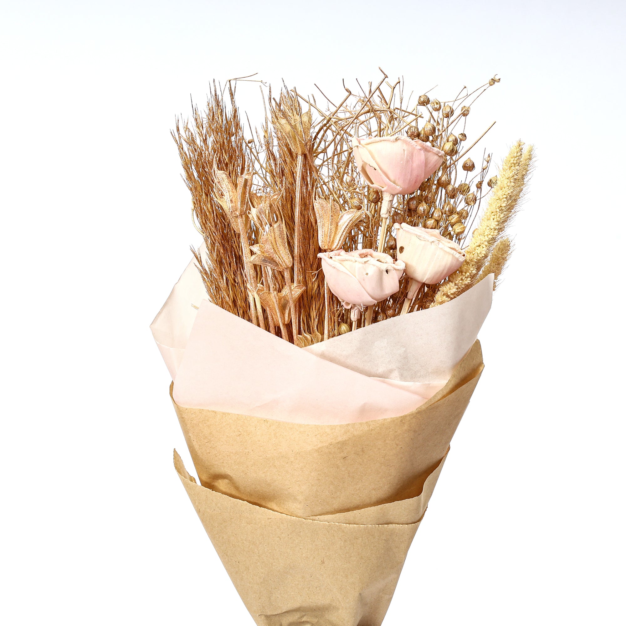 Add a soft, romantic charm to your space with this Handmade Dried Flower Bouquet featuring blush pink Shola flowers, natural wheat stalks, and textured dried grasses. Wrapped in layered kraft and pastel-toned paper, this bouquet exudes rustic elegance and earthy beauty—ideal for eco-conscious decor and minimalist interiors.