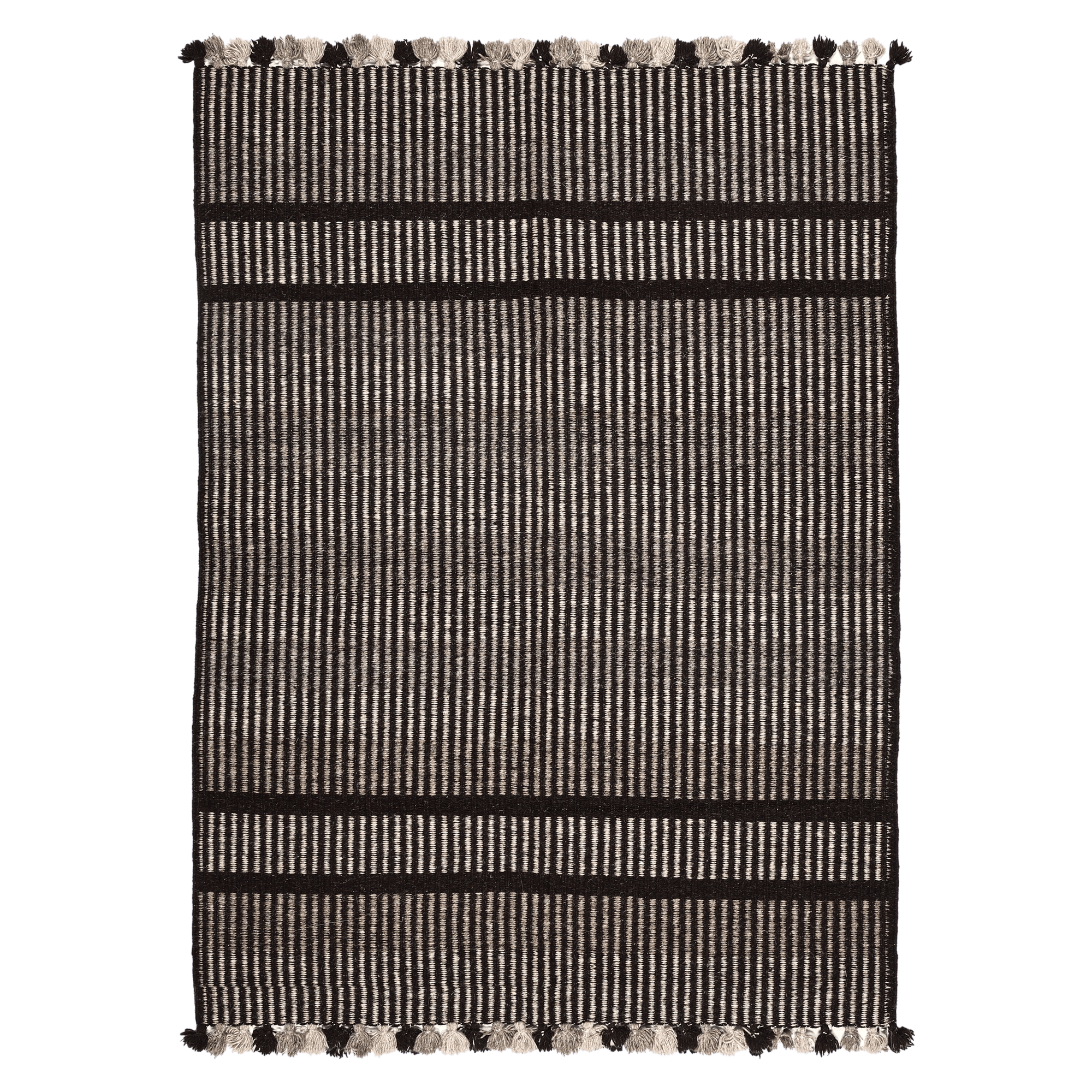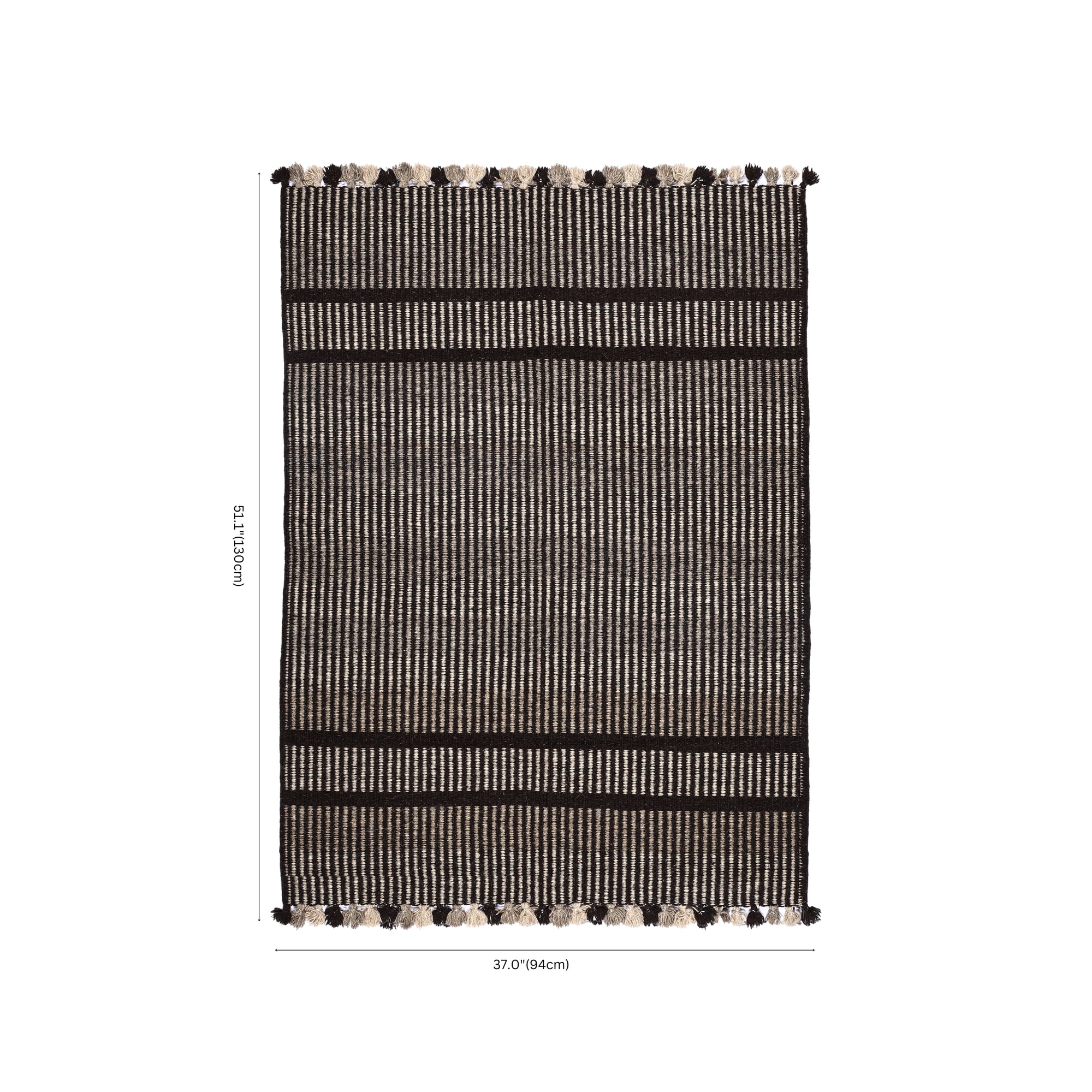 Elevate your space with this charcoal-stripped rug, handwoven by skilled artisans of Jawaja Beawer. Known for their exceptional traditional loom skills, this community creates pieces that express resilience, tradition, and timeless beauty. This dhurrie features a charcoal-black striped pattern, made from natural wool, giving it a refined look. This product features hand-tied tassels on both edges, creating an artisanal look.