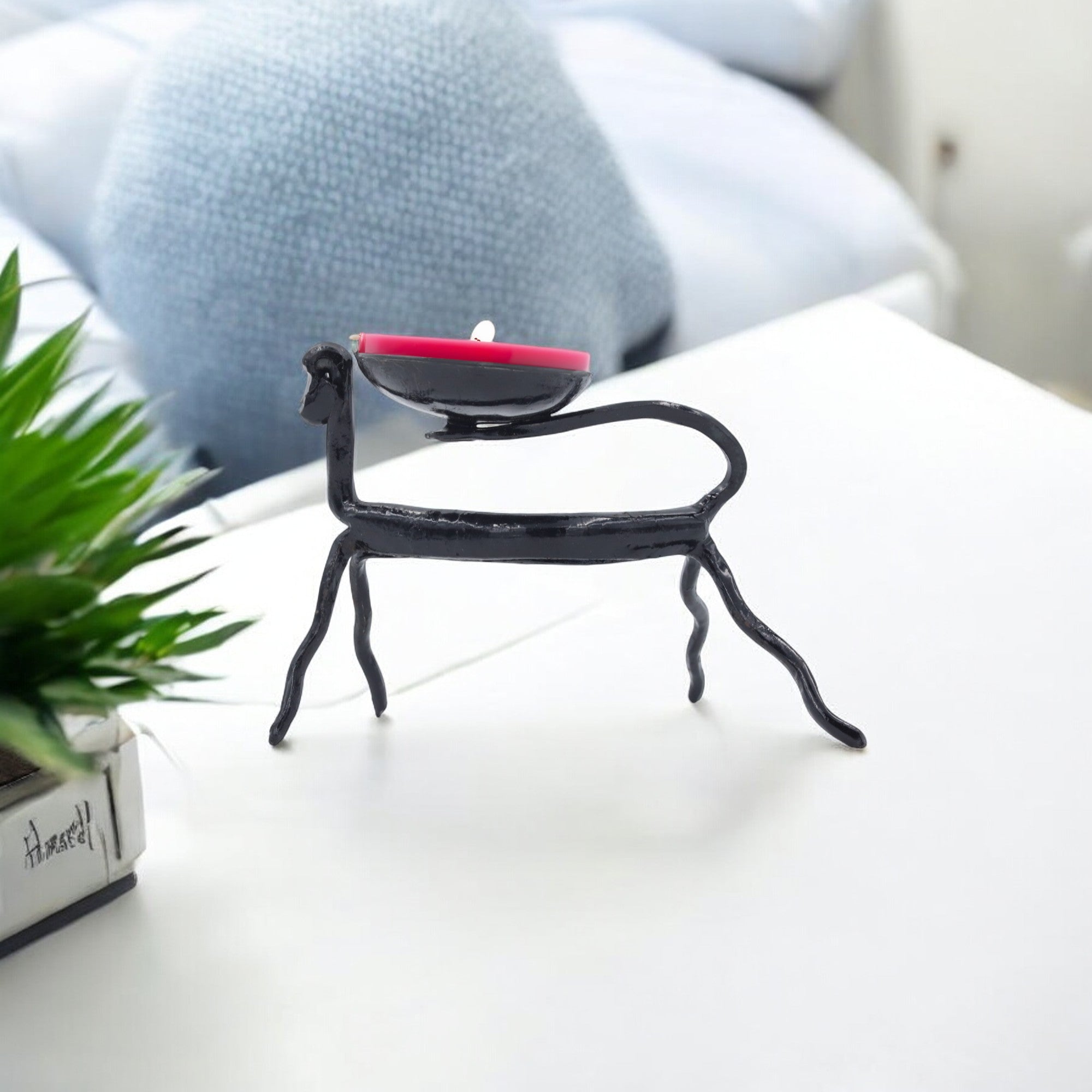 Brighten your space with this enchanting iron T-light holder, featuring a whimsical animal balancing a candle tray. Ideal for small T-lights, it adds warmth and charm, making it a perfect gift or stylish decorative piece.