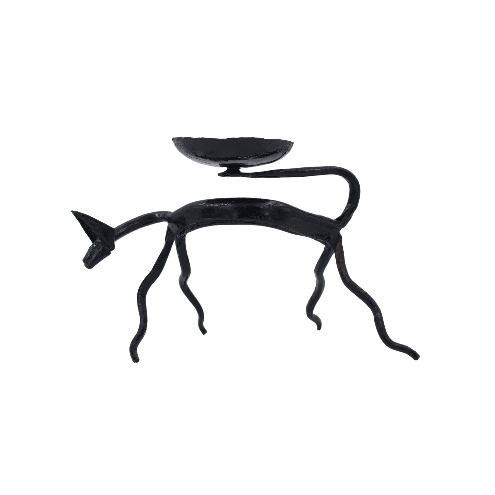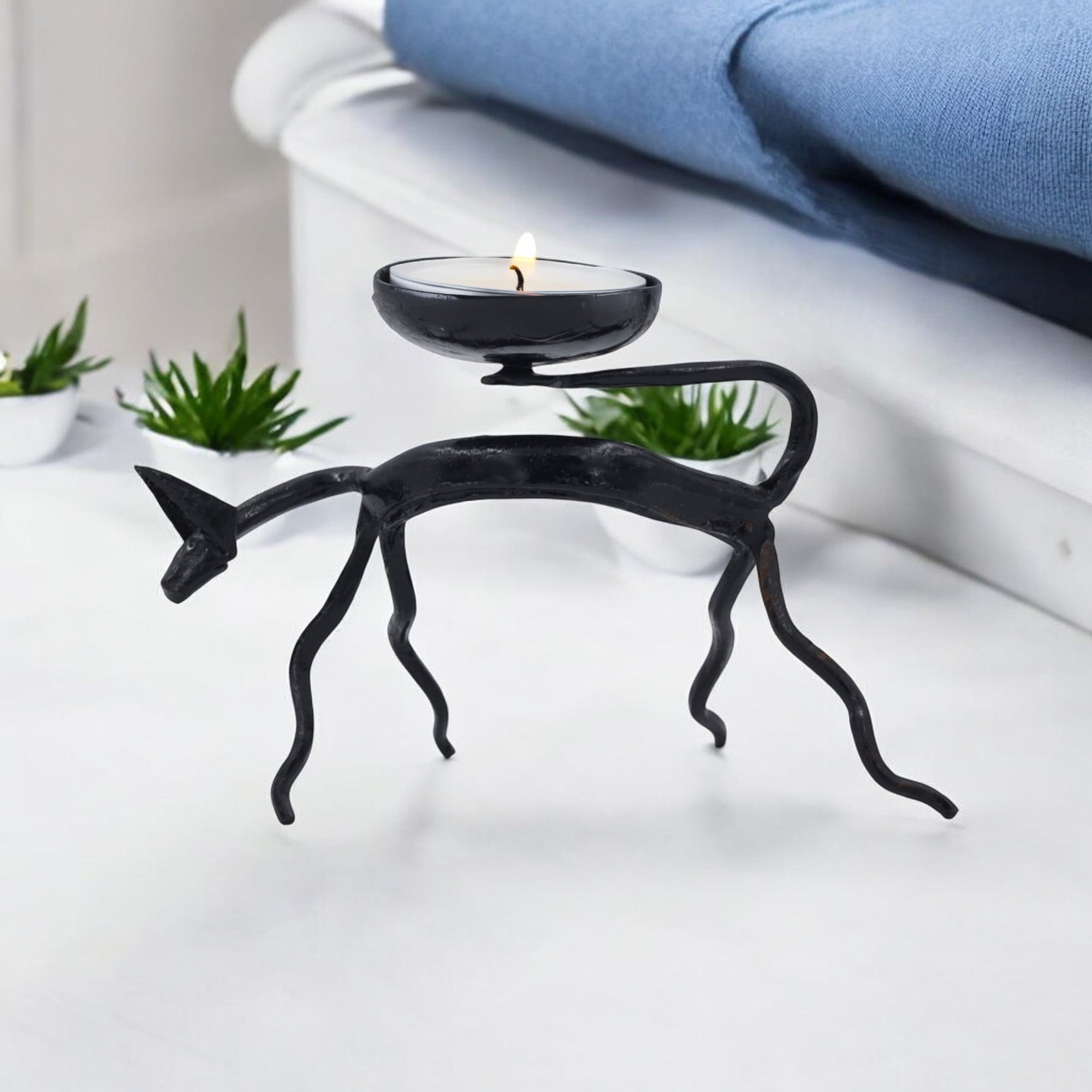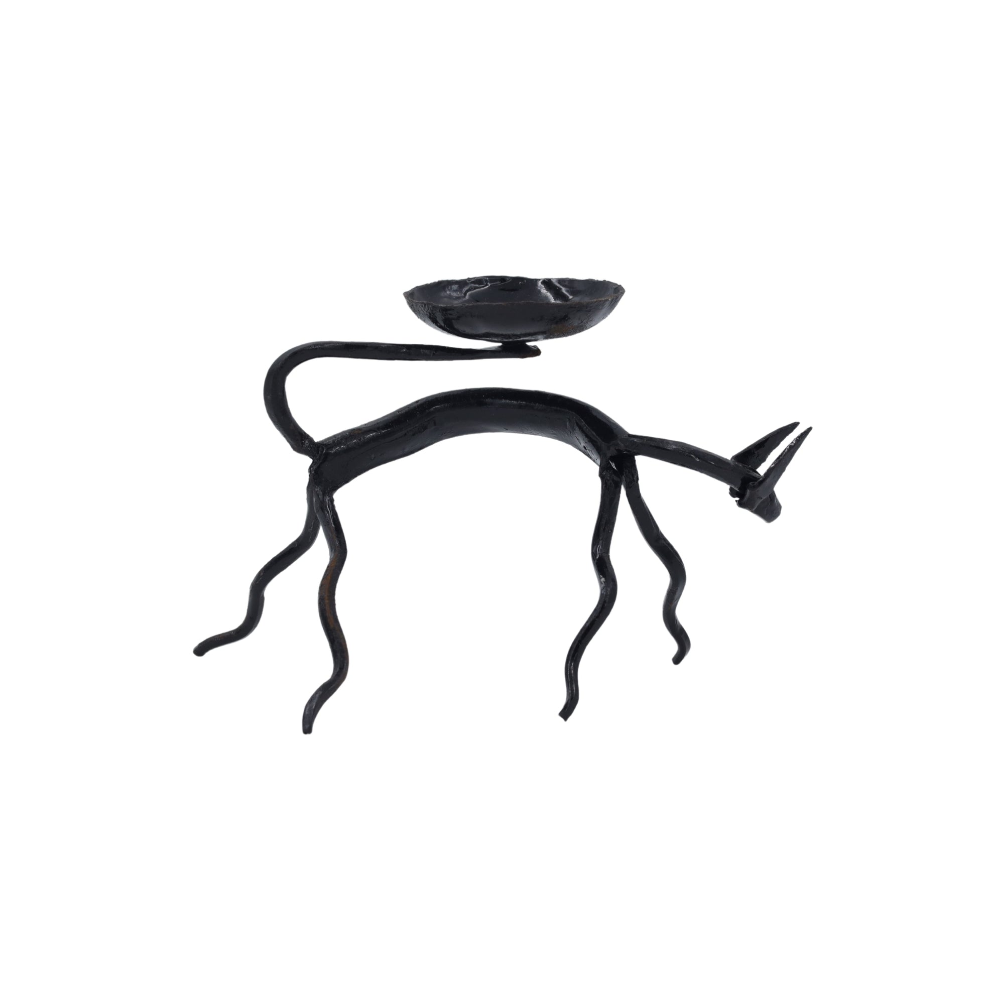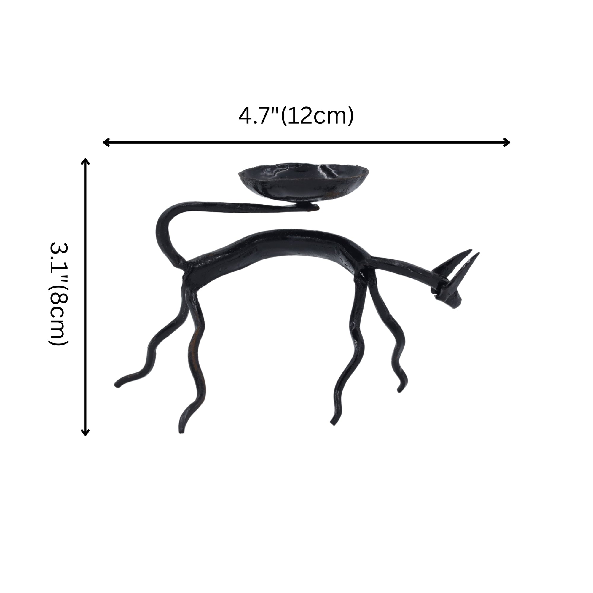 Brighten your space with this charming iron t-light holder, featuring a deer design, balancing a candle tray. Ideal for small t-lights, it creates a warm ambience and serves as a delightful gift or decorative addition to any space.