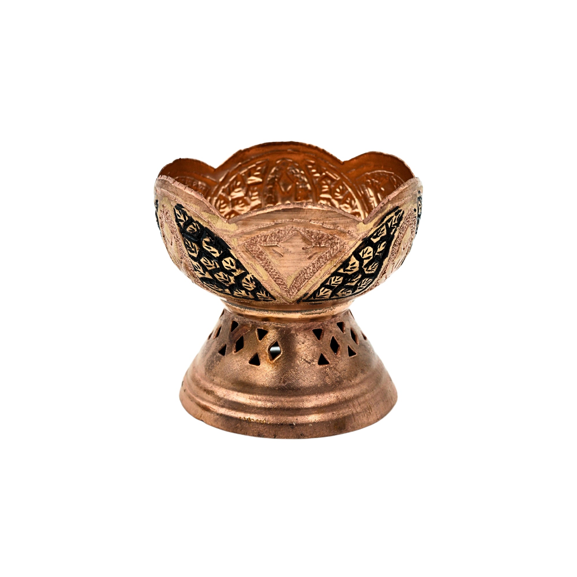 This exquisite Kashmiri copper dessert bowl showcases traditional craftsmanship with intricate Kandkaari leaf engravings. Its graceful shape, with its wide rim and softly curved base, brings beauty and refinement to any space.
