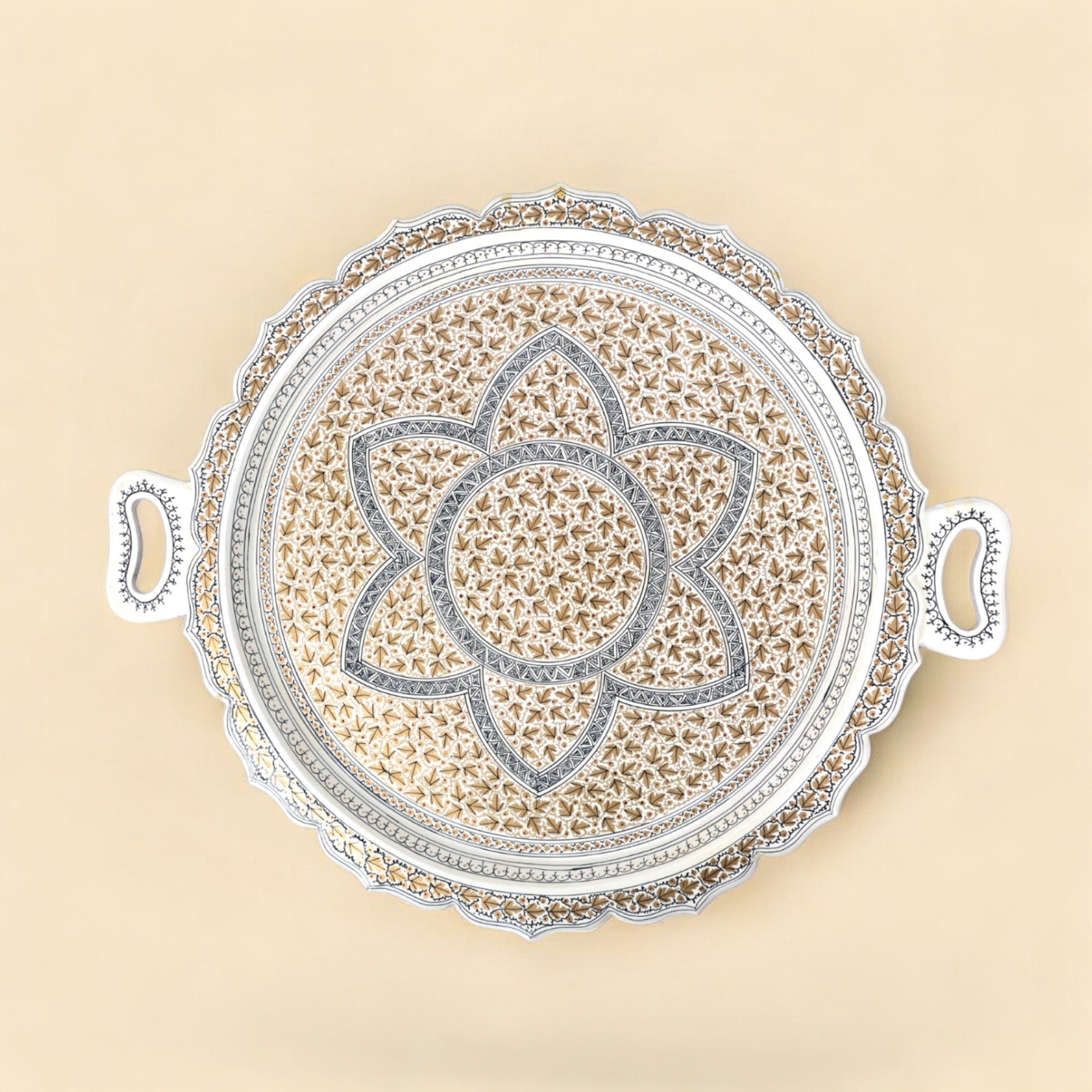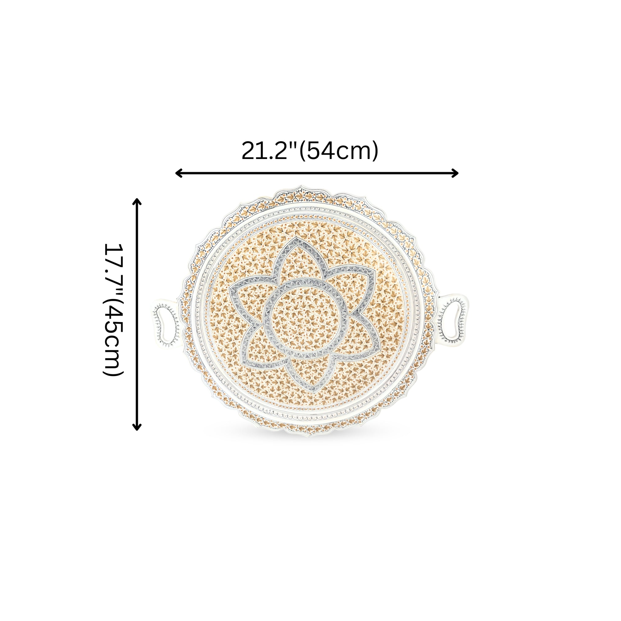 In the enchanting realm of Kashmir, Papier-Mâché embodies an artistic spirit. Each intricately hand-painted chinar leaves detail carries the essence of heritage. This round white and golden tray, beautifully adorned, brings a touch of refinement to your decor. Its versatile design makes it perfect for serving or as a charming decorative piece.