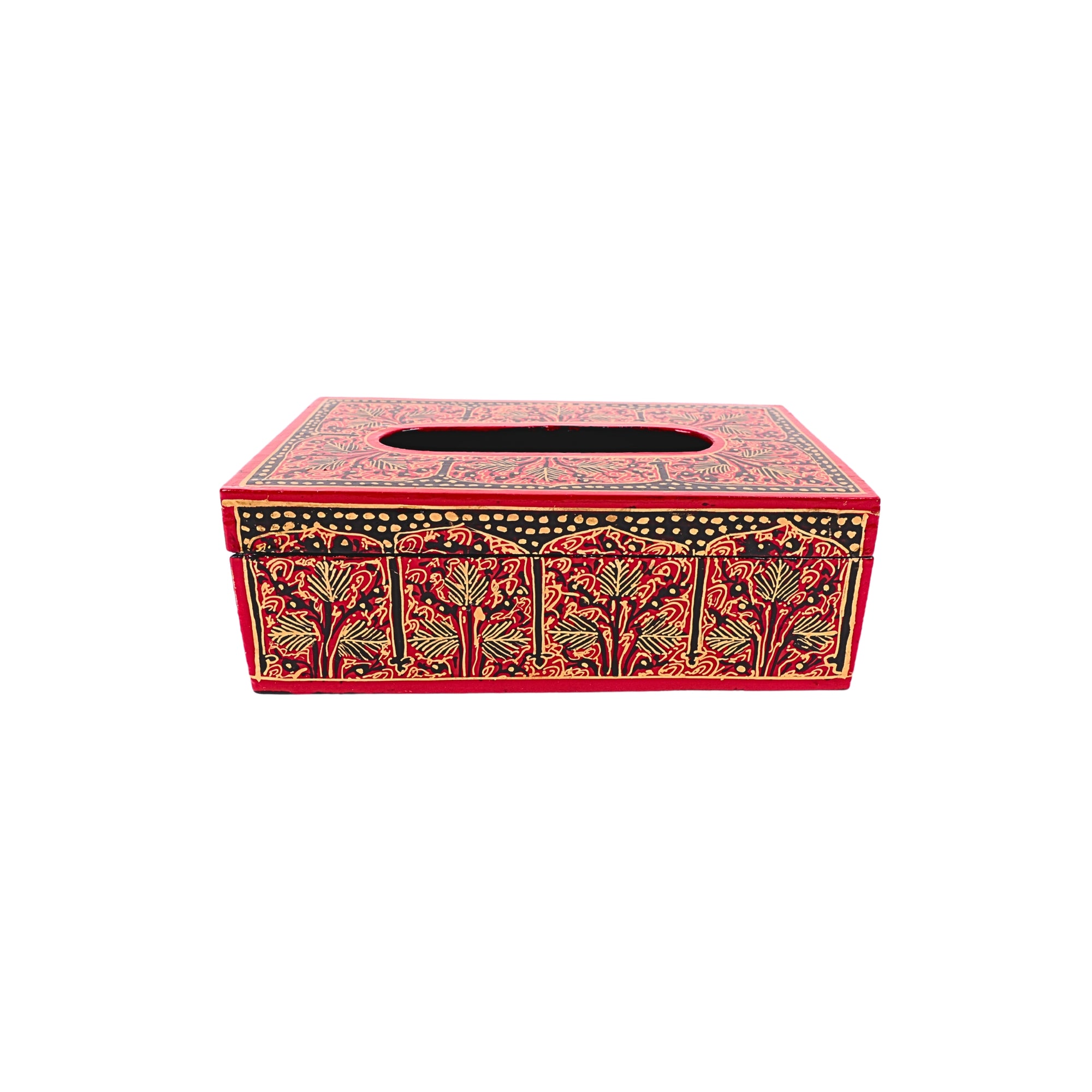 This Papier-Mâché tissue box, adorned with beautifully hand-painted chinar leaves, brings the essence of Kashmiri craftsmanship to your home. Its vibrant red base adds an air of elegance, turning a functional necessity into an eye-catching decor piece.