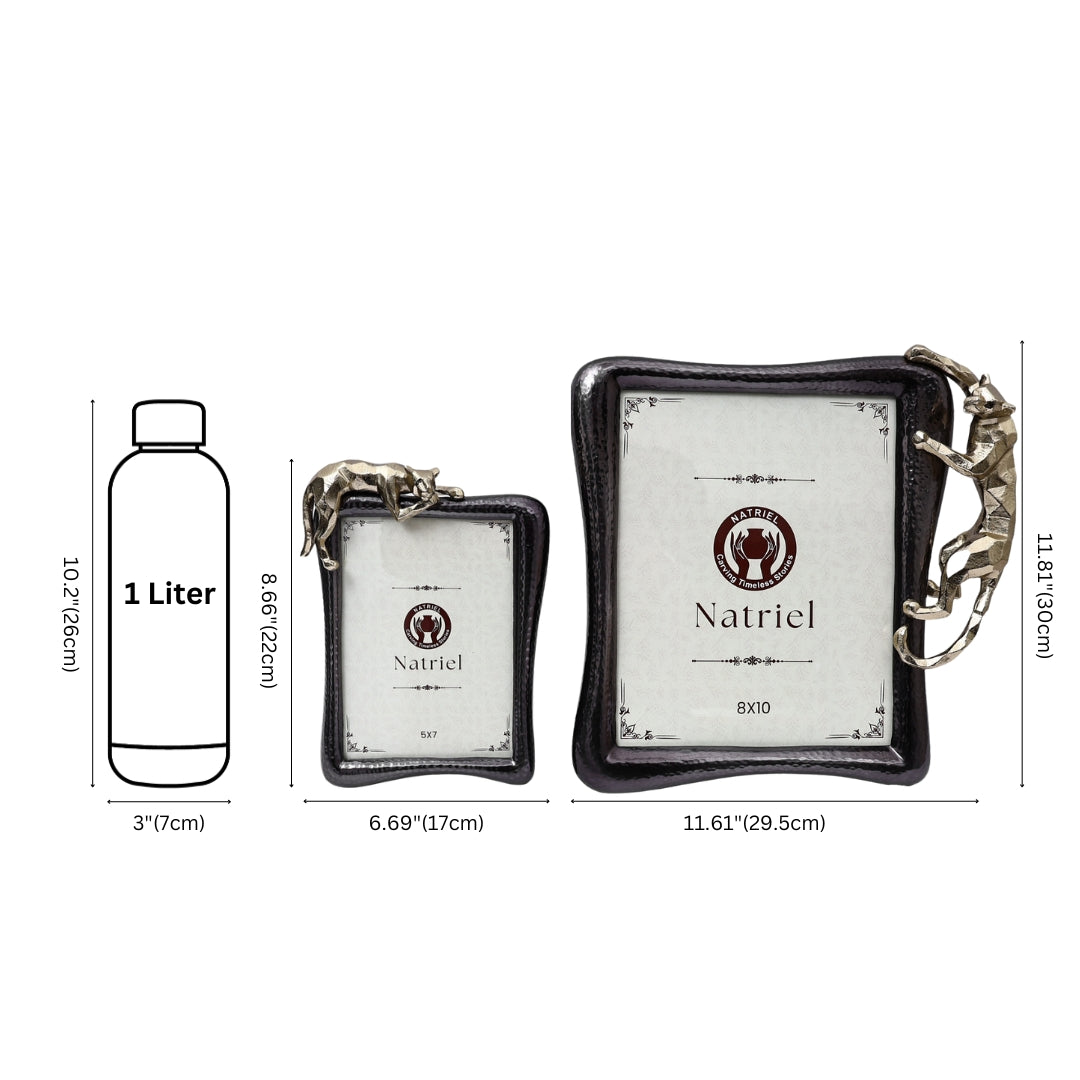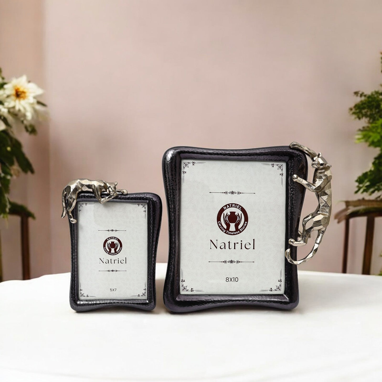 Bring home this vintage handcrafted Silver panther photo frame to elevate your home décor. Silver Panther is meticulously handcrafted on the dark brown frame giving it an exclusive look. This photo frame is a blend of functionality and artistry where crouching Panther is hammered to the surface. It is Striking piece which add wildness with sophistication to any surrounding. It is a perfect piece to store your adventurous memories of holidays. It comes in a set of two where one panther is added to the top in 5*7 sized and in other frame it is added to the side in 8*10 size.