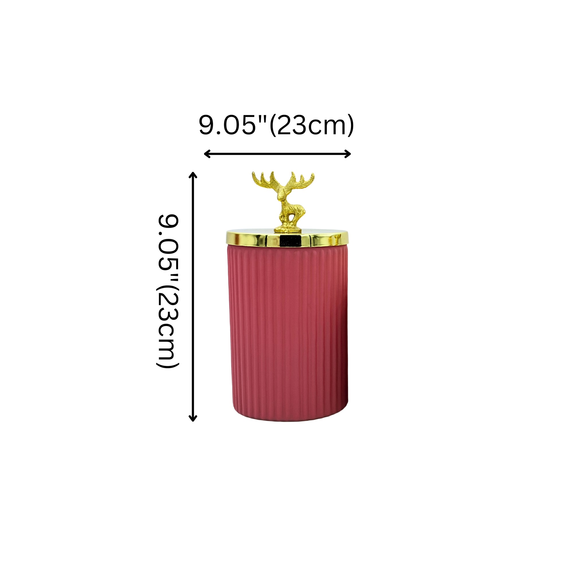Our stunning glass container set, comprising three pink containers with a unique ribbed design. It features a gold-toned lid with charming deer antlers handle, ideal for storing tea, coffee, salt, and sugar.