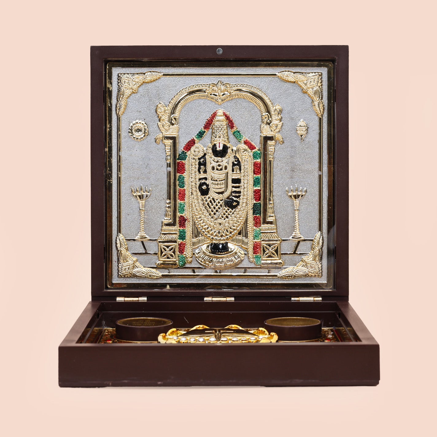- Tirupati Balaji Box Set – This product is intricately crafted with gold-coated metallic sheets that depict the Tirupati Balaji figure in a vibrant setting.