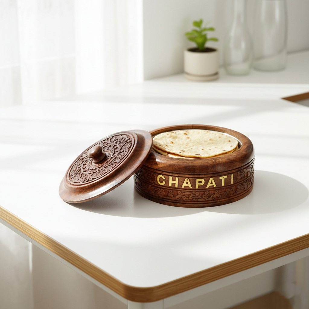 Experience the charm of this intricately carved wooden chapati box, blending tradition with modern elegance. Crafted from premium wood with delicate inlay, it features a spacious interior for chapatis and a beautifully detailed lid, making it a perfect and timeless gift.